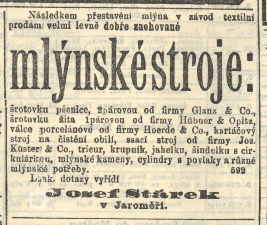 V městě Jaroměř, jejímž majitelem je císařovna Eleonora, jsou v roce 1651, ve mlejně obecním pod kostelem, uvedeny tyto osoby: Jan Hošek tovaryš (stár 20 let), Alžběta (52) podruhyně a pekařka, Adam Stehlík (62) sládek a jeho dcery Lidmila (19) a Dorota (16), Jan Pařízek (32) koželuh a jeho manželka Magdalena (27) a matka jeho Barbora (59), všichni katolíci. Žádný mlynář uveden není.