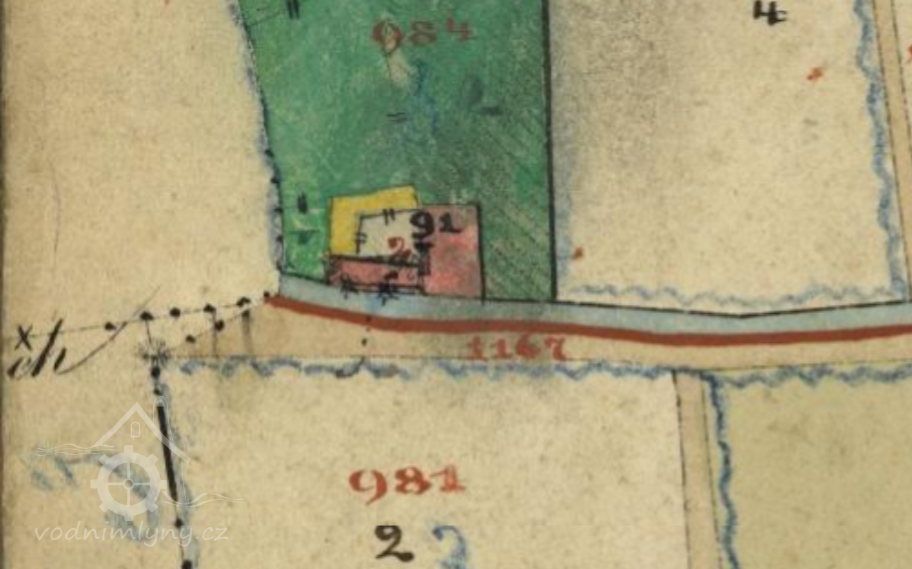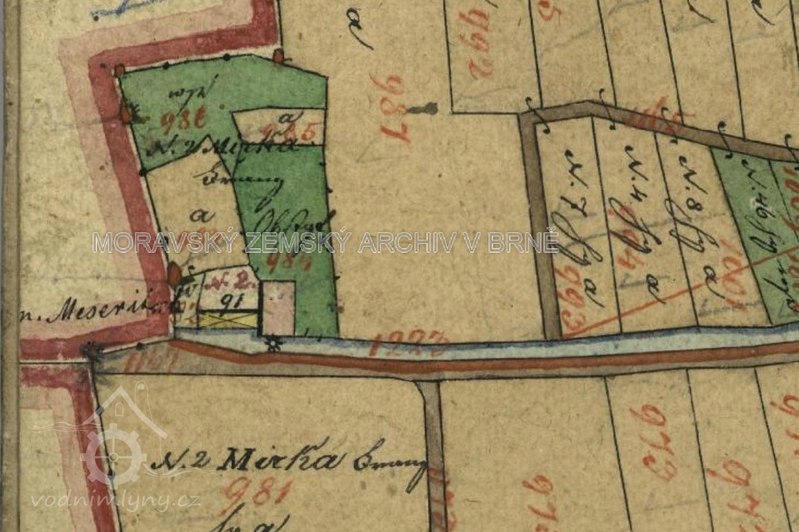 Vodní náhon v Hrachovci Vodní náhon je v současnosti neznatelný a zapracovaný do zemědělských polností v rovinaté části na levém břehu řeky Bečvy. Sytil ho Hrachovecký potok a jeho přítok pramenící pod vrchem Vichury (471,5 m n. m.). Voda pak vtékala do řeky Bečvy jako levobřežní přítok pod Krásenským jezem nedaleko Sklárny v Krásně nad Bečvou, dnes Valašské Meziříčí. Existovala také mlýnská strouha, jak dosvědčuje „Technická zpráva“ o úpravě Bečvy z roku 1937. V km 25.480 byl v roce 1924 postaven majiteli vodních práv na mlýnské struze železobetonový komorový jez společenský s kolmým přepadem za příspěvku fondu regulace Bečvy. Přívodní strouha jezu Hrachoveckého a její odpad se nachází na levém břehu řeky Rožnovské Bečvy