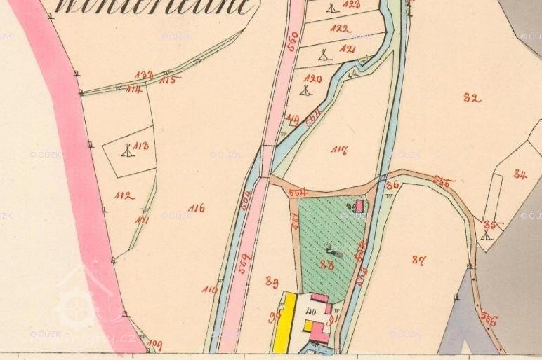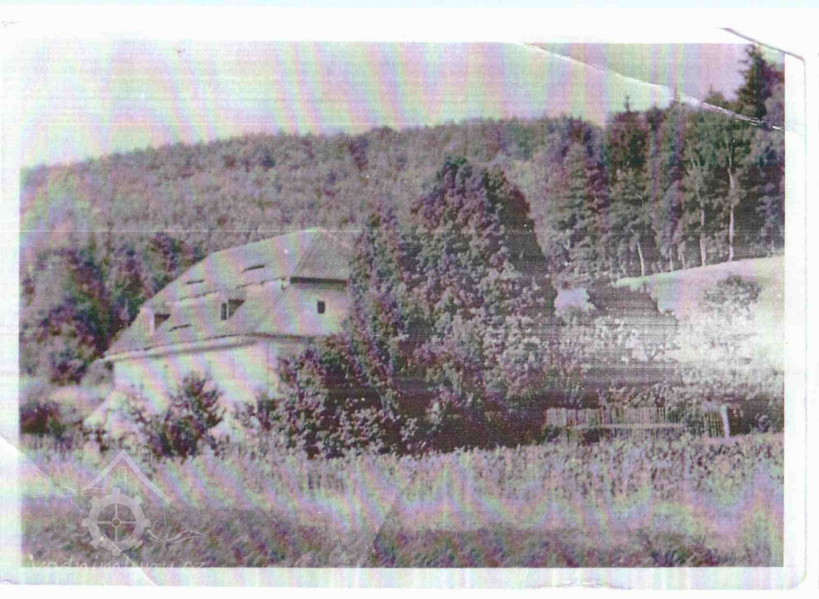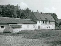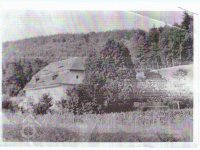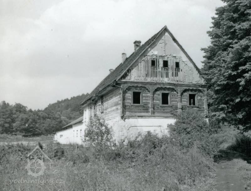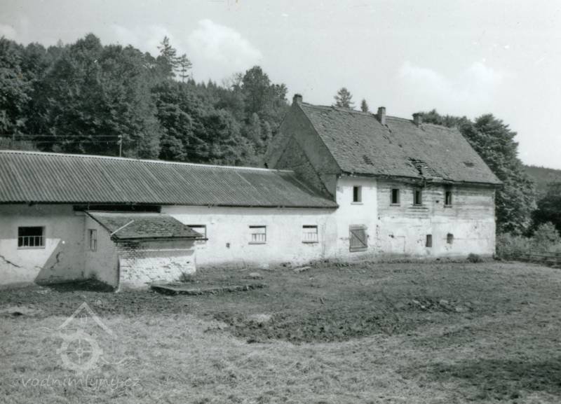 Pohled na dnes již zbořený mlýn. Fotografie pochází od potomků mlynáře dnes žijící v Německu. Za poslání fotografie děkuji Zdeňce Bílkové, před rokem 1945, © autor neznámý