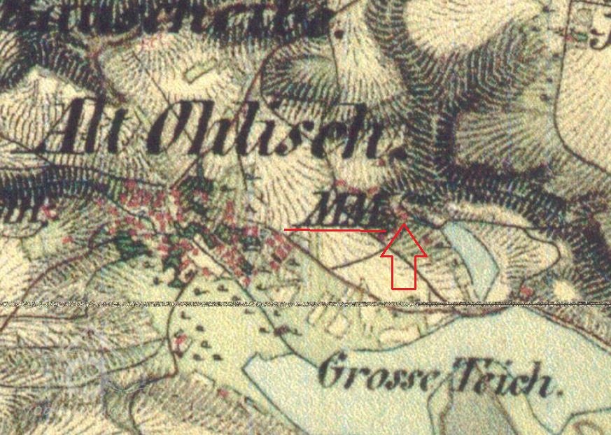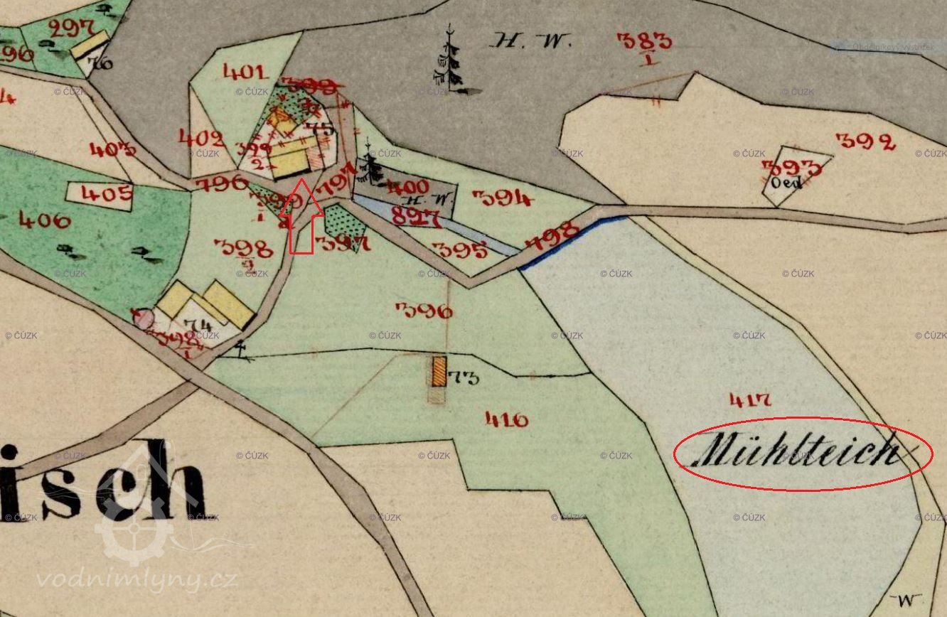 Na originální mapě stabilního katastru z roku 1843 je menší ze dvou rybníků ve Staré Olešce, nazývaný dnes Malá Oleška, zapsán jako Mühlteich. Mlýn stával asi 100 od hráze rybníka, na pozemku s tehdejším číslem 399/2, je zakreslen jako budova ze spalného materiálu.