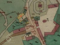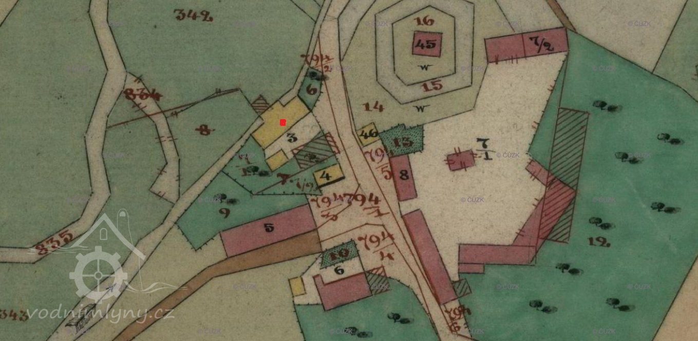 Skica, otisk a originální mapa stabilního katastru 1838: spalná budova obdélníkového tvaru s přístavkem na náhonu, jedno kolo, majitelem Karl Stöhr. Nedaleko se nachází tvrz s vodním příkopem.