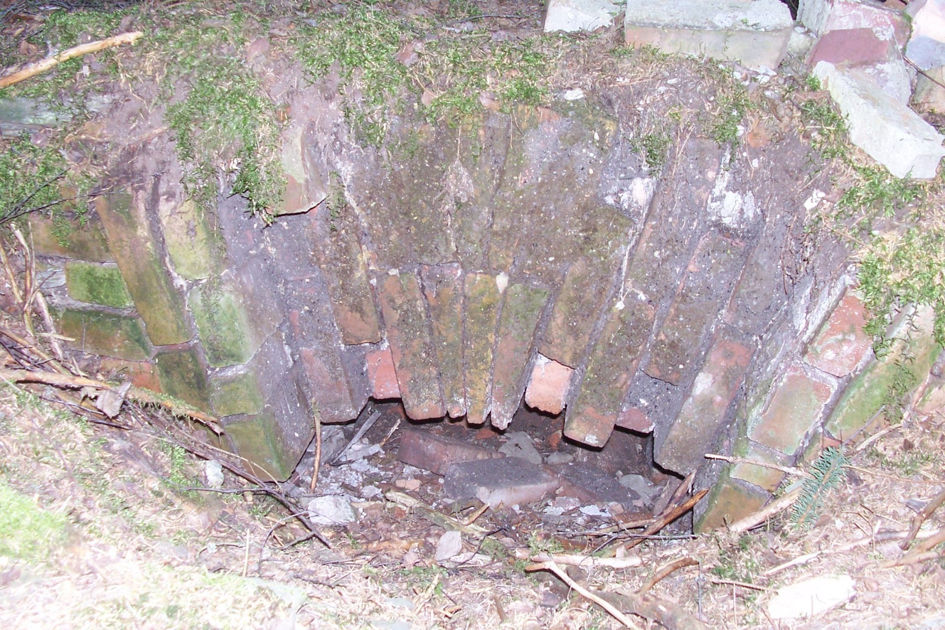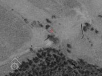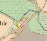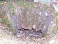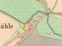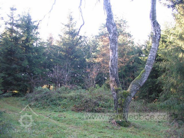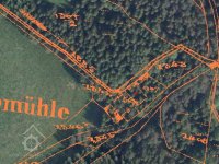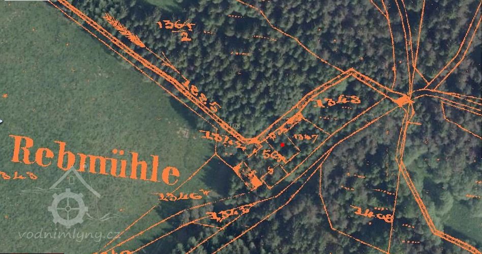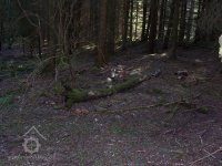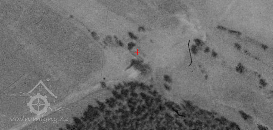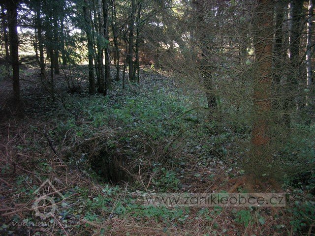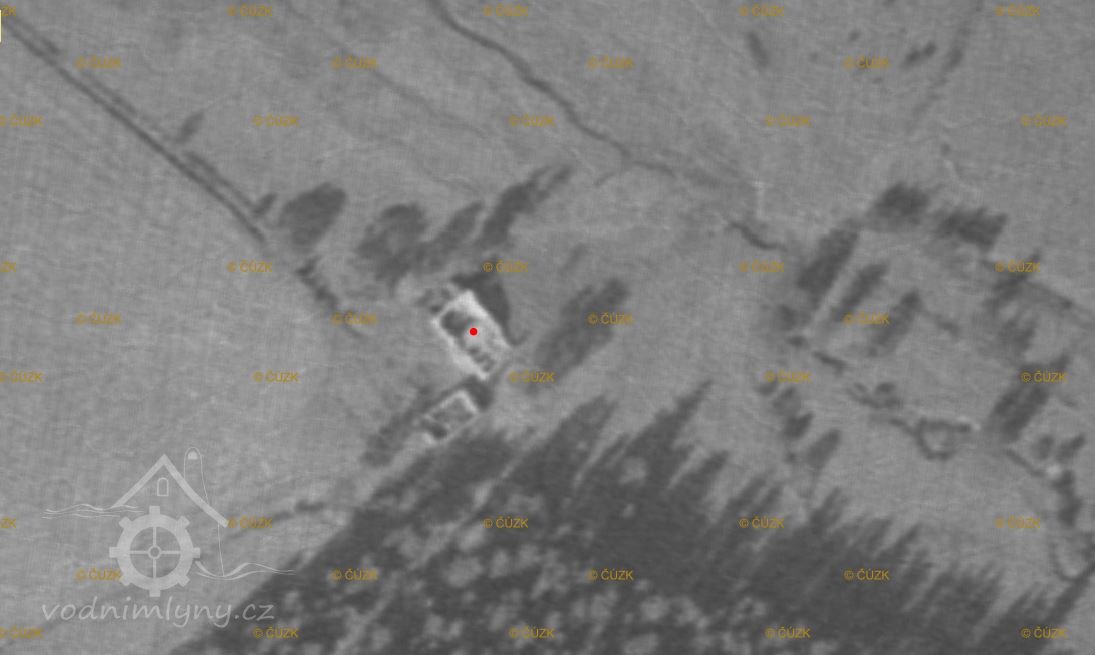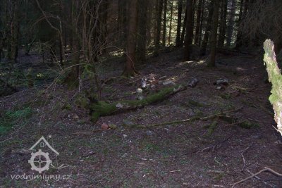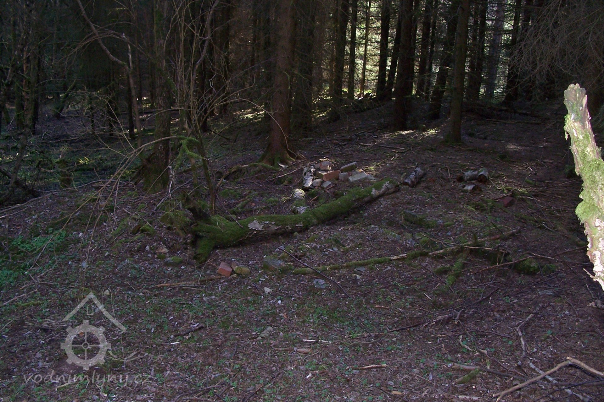 Zbořený mlýn. Jeho trosky jsou dobře patrné, jsou však schovány v lese.