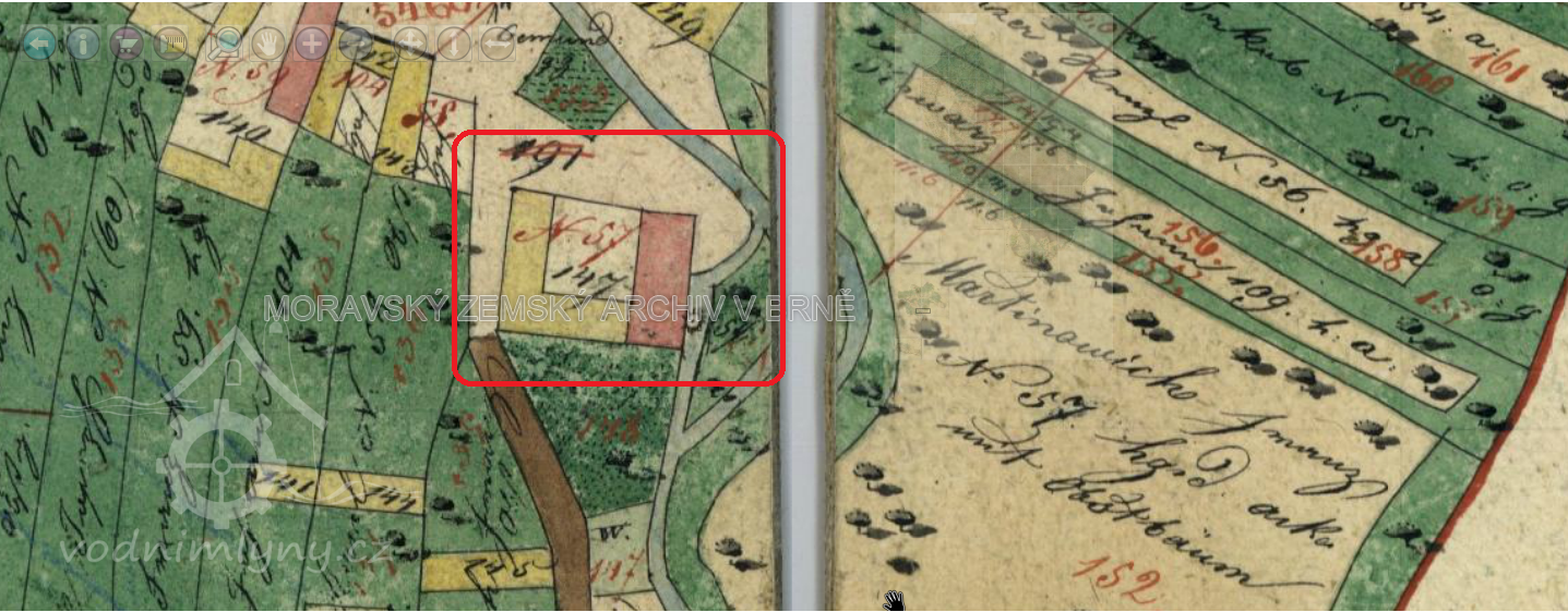 Podle současného majitele domu Josefa Spáčila byl mlýn postaven za domem Č. 57 (Spáčilovi).