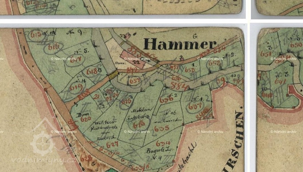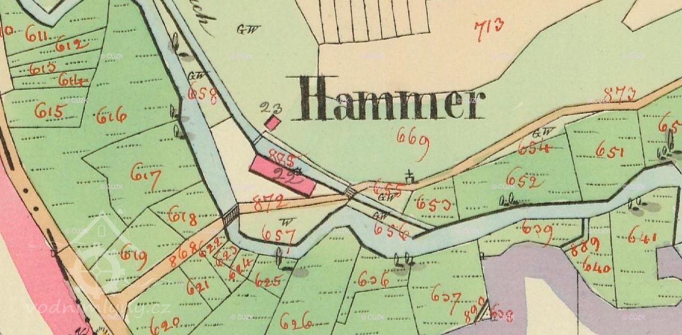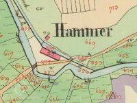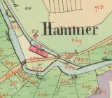 1838 – Skica a otisk stabilního katastru – na náhonu z Radbuzy podlouhlá obdélníková již nespalná budova s jedním kolem a č.p. 22, nedaleko malá zděná budova č.p.23 a malá kaplička. Název Hammer.