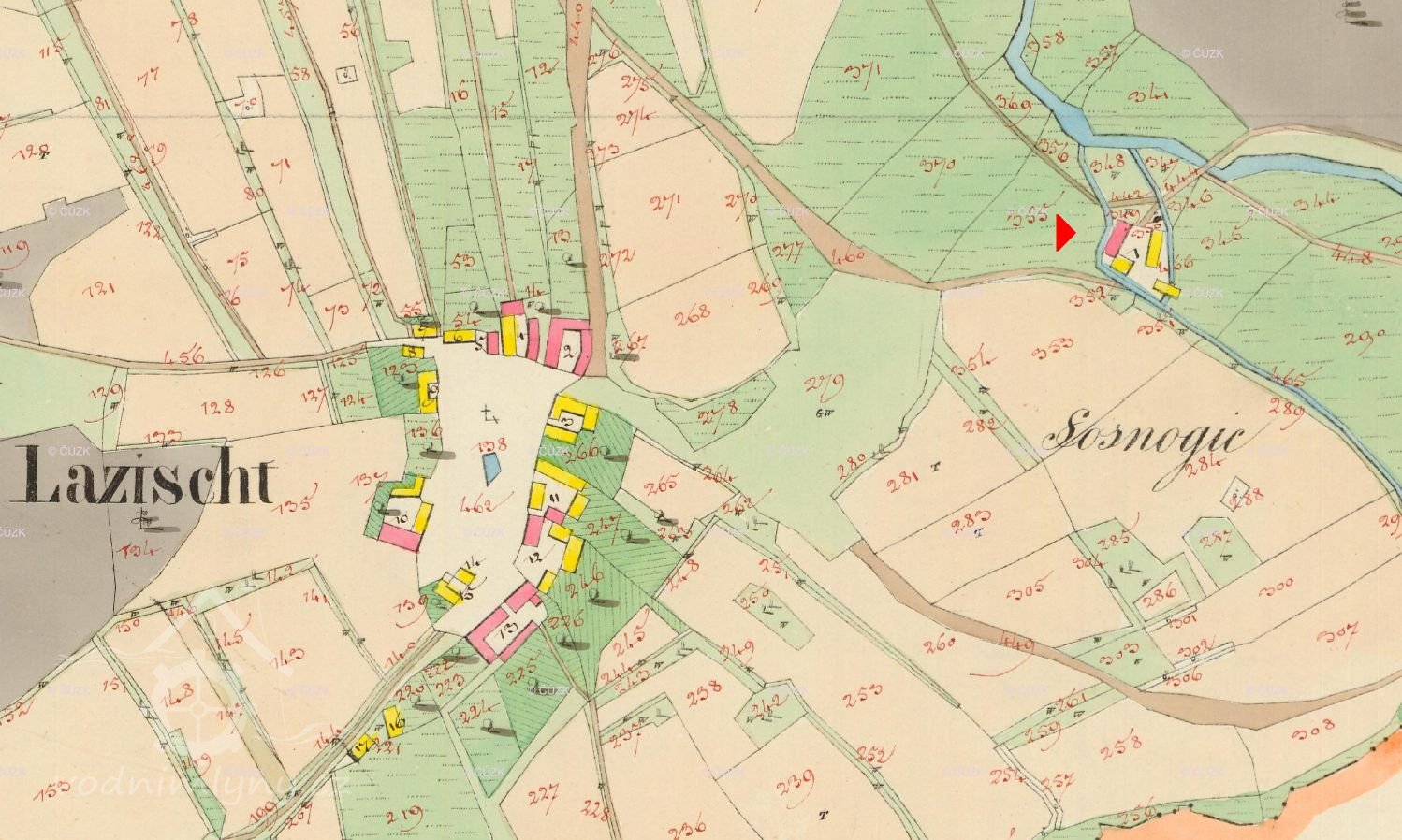 1927: Do mlýnské stoky, uzavíratelné stavidlem, vedena je voda Zlatého potoka vzdutá dřevěným jezem s kamennou výplní o délce v koruně 12,2 m. Na levém břehu náhonu, na rozhraní pozemků 309 a 312 ústí do náhonu odpadní stoka z mlýna v Lažišťce. Mlýnská stoka od jezu k vantrokům měří 630 m. Dřevěnými žlaby délky 6 m, světlé šířky 1,34 m a hloubky 0,5 vedena je voda do dvou dřevěných koryt uzavíratelných stavítky o rozměrech 55x33 cm a 30x30 cm. Jalové stavítko se nalézá na levém břehu náhonu a má šířku 75 cm. Odpadní strouha ústí 52 m od mlýna do Zlatého potoka