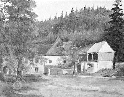 1682 mlýn postaven z kamene, vápna a hlíny a krytý šindelem.