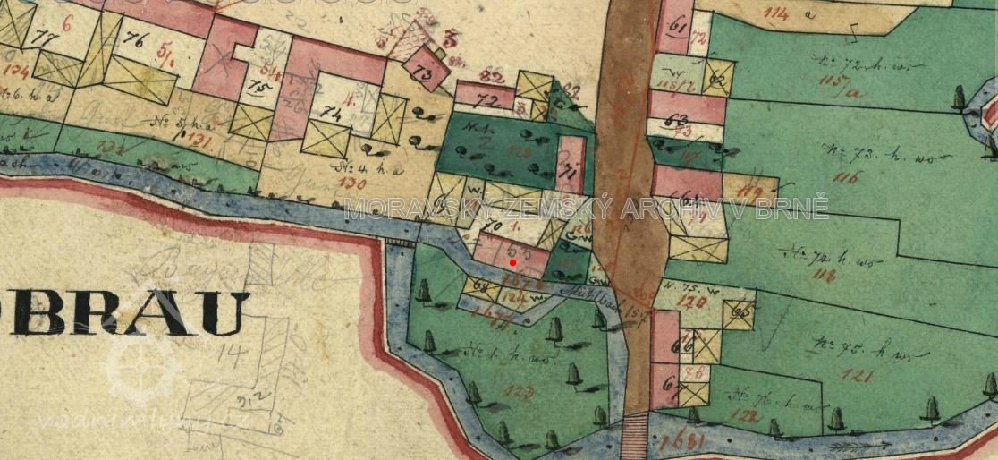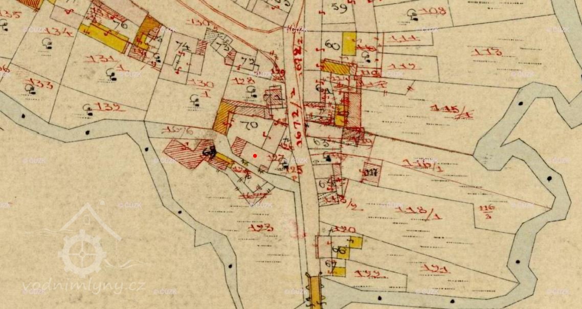 Značka mlýna je na I. a II. vojenském mapování. Na císařském otisku je mlýn zděná budova se dvěma vodními koly na náhonu z říčky Bobrůvky.
