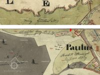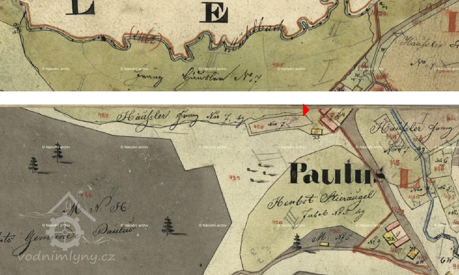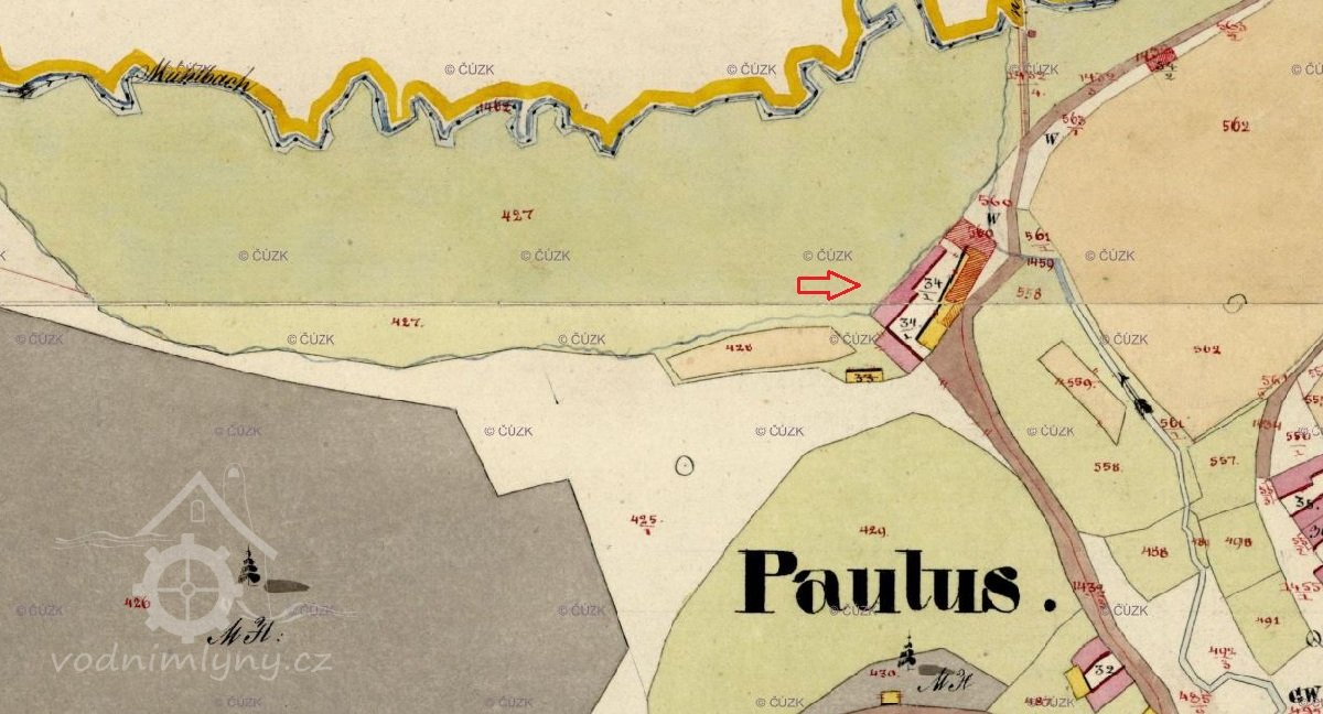 Mlýn, stál v k.ú.Křížovice/Krzizowitz/ dnes: Křížovice u Ktiše/ a je zobrazen na mapě stabilního katastru :Čechy -3672-1, mapové listy číslo 002 a 005, v místní části osady, zvané Paulus.