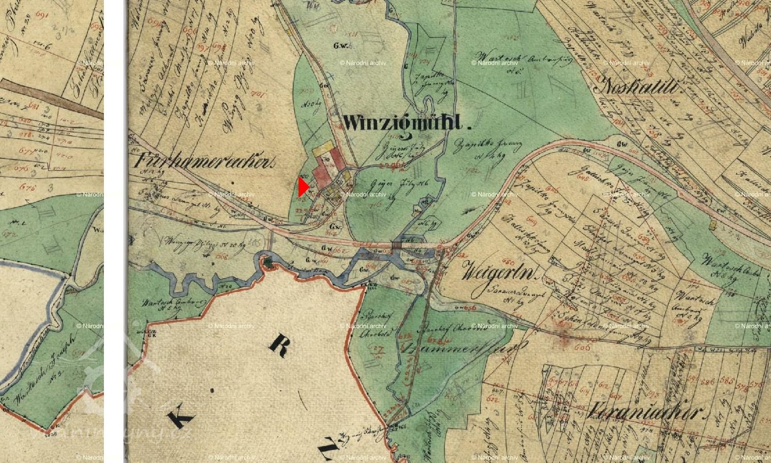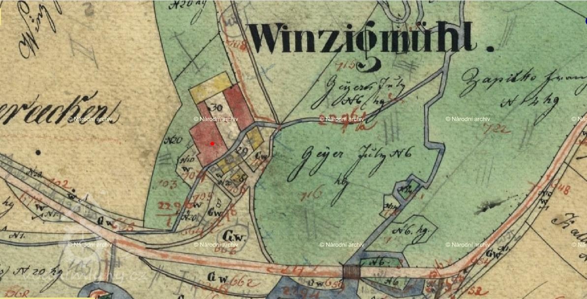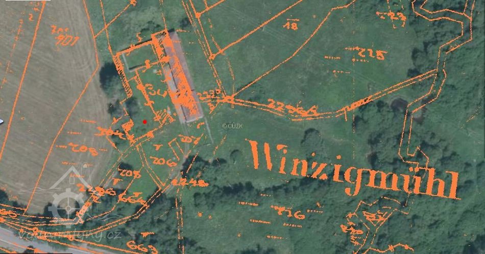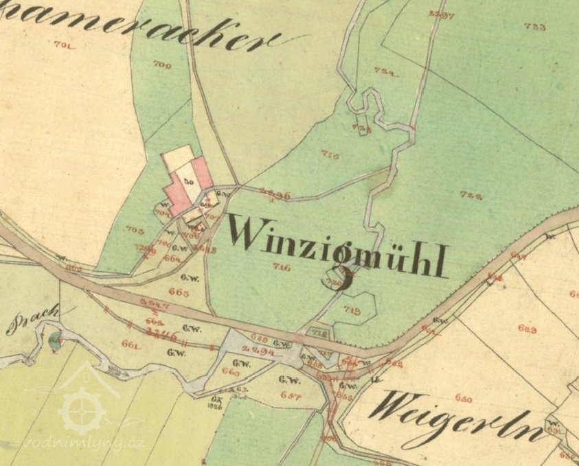 Vody Zlatého potoka tečou od Planského mlýna k dalšímu mlýnu, který je využíval - Winzigovu mlýnu. Dnes je na samotě "U mlýna" pod Zahořím zachována obytná a hospodářská část. Literatura udává jeho existenci v r. 1702. Není však zřejmé zda byl hamrem a mlýnem od začátku nebo až hospodářským vývojem. V roce 1930 měl mlýn jedno vodní kolo a byla při něm i pazderna v r. 1932 zrušená.