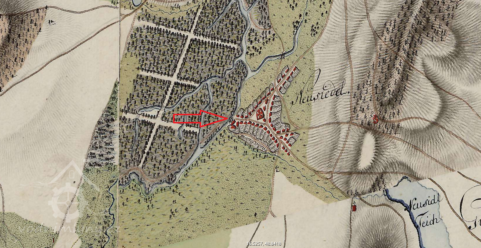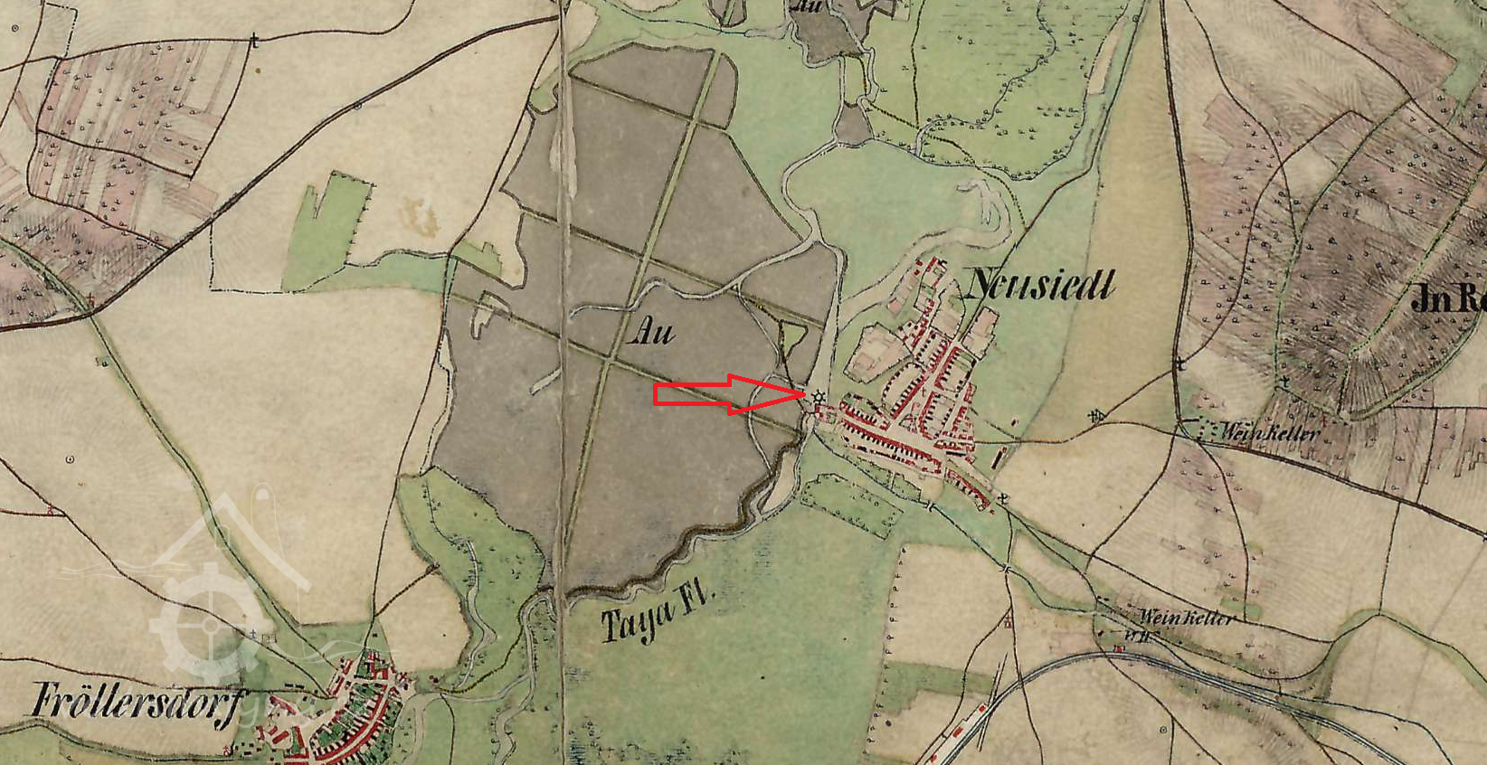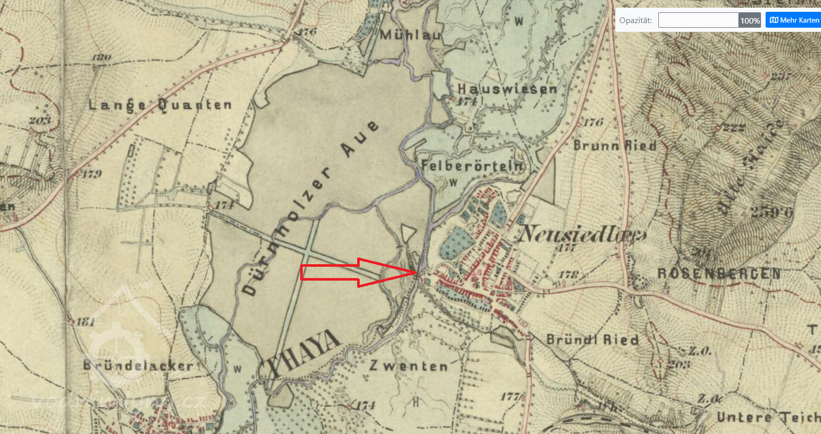Velký barokní mlýn stával na jihozápadním okraji obce u řeky Dyje.