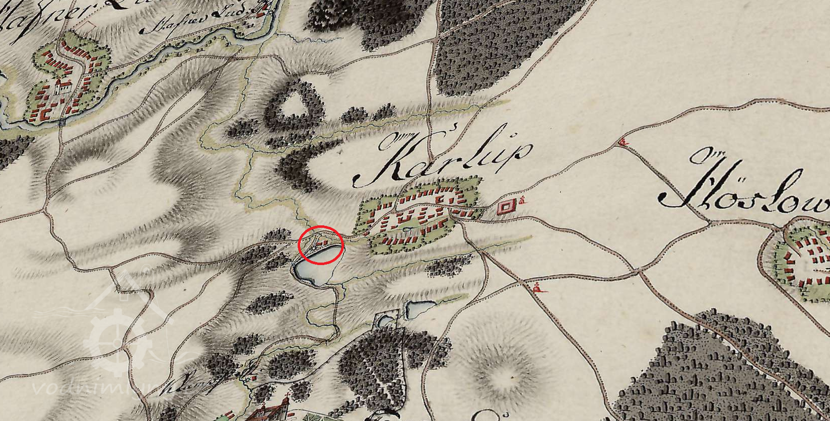 Mlýn stojí na samotě západním směrem od Korolup.