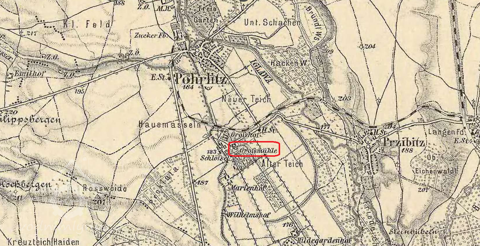 Velká zchátralá budova bývalého mlýna. 1936 uváděn jako státní.