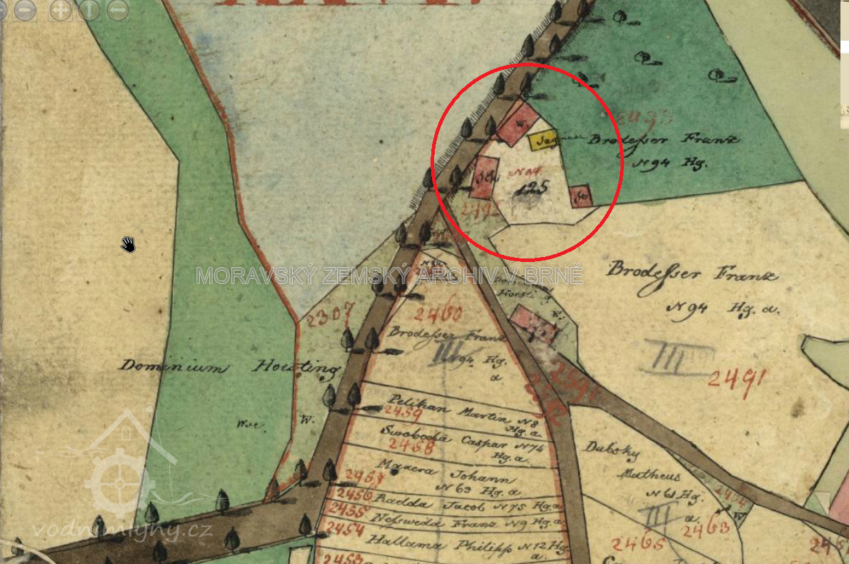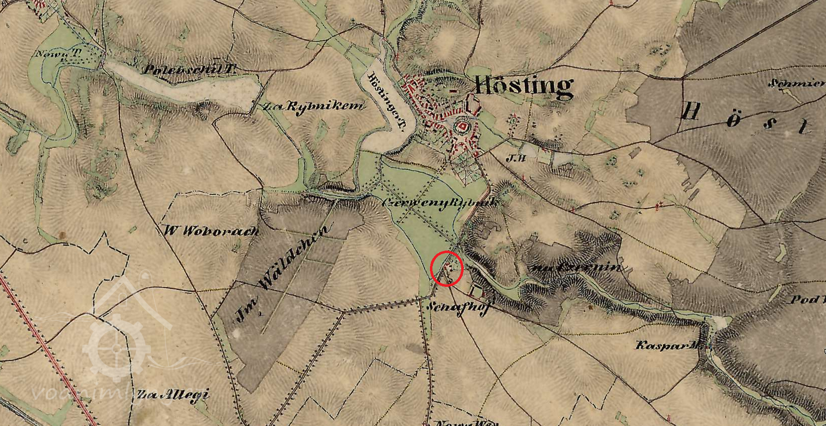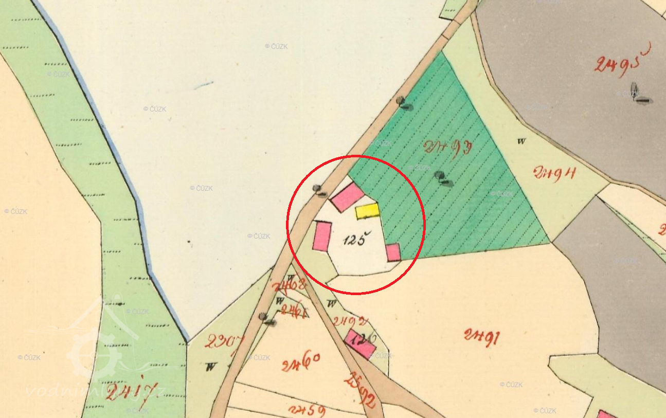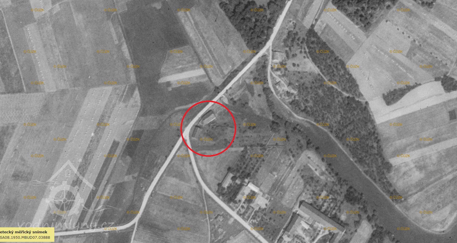 Červený mlýn stával pod hrází Červeného rybníka. Dnes je na jeho místě postaven nový rodinný dům.