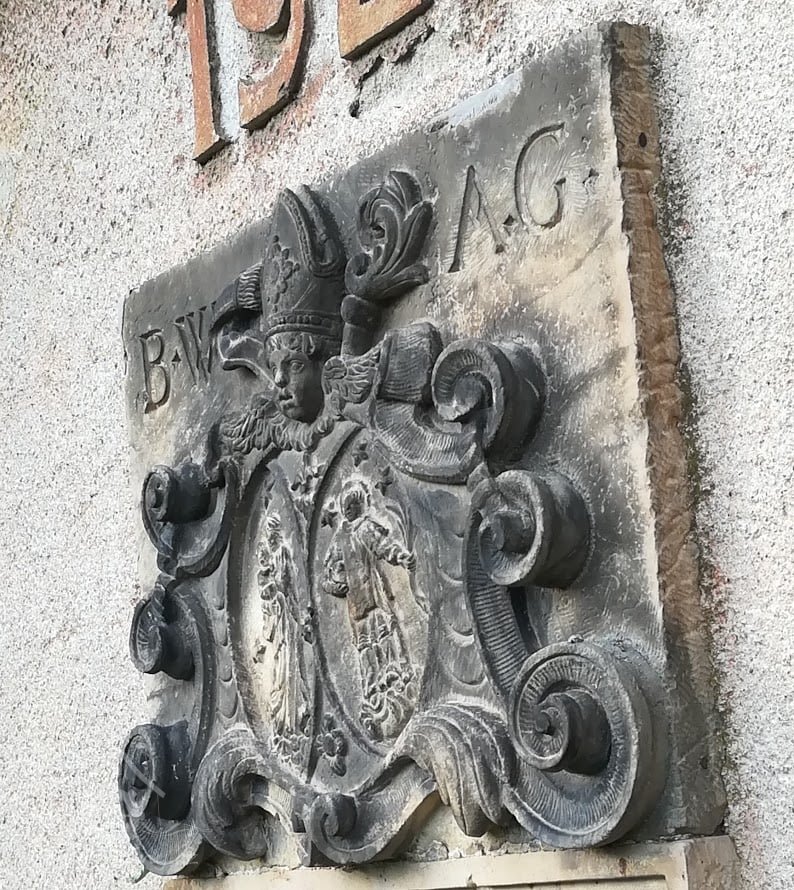 Znaky kláštera Hradisko a opata Bernarda Wancka ve štítu, 2020, © Náš mlýn v Hradčanech, (Prvky na obrázku: náhrobky, pamětní desky, umělecké prvky (sochy, malby, reliéfy))