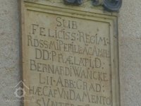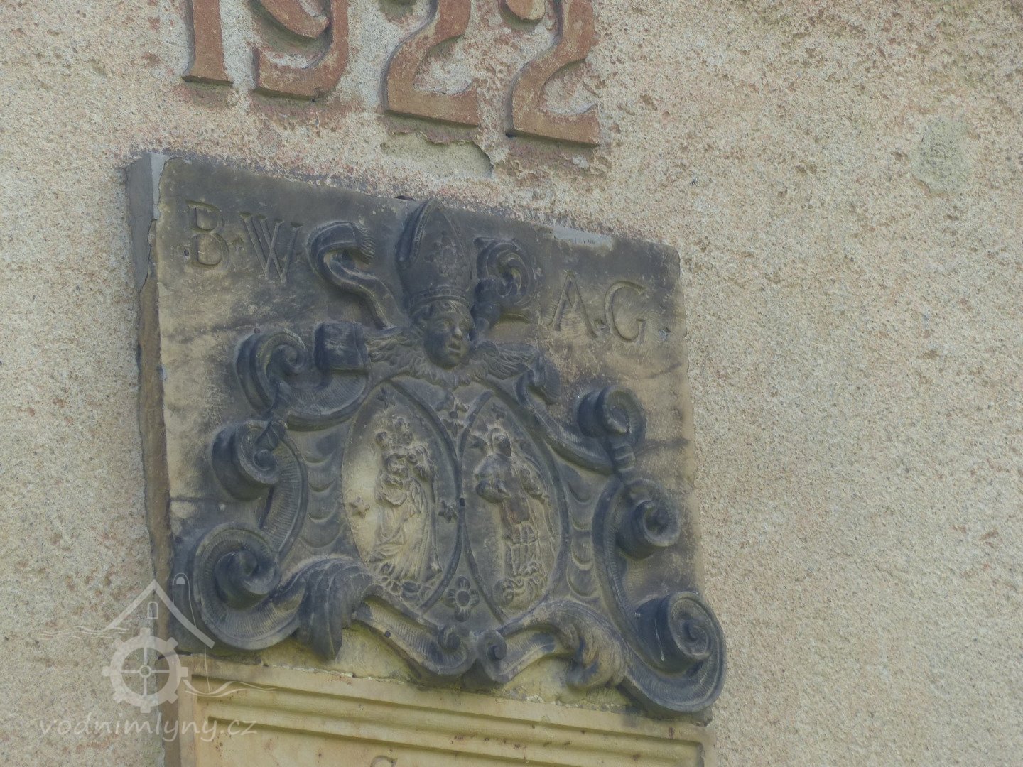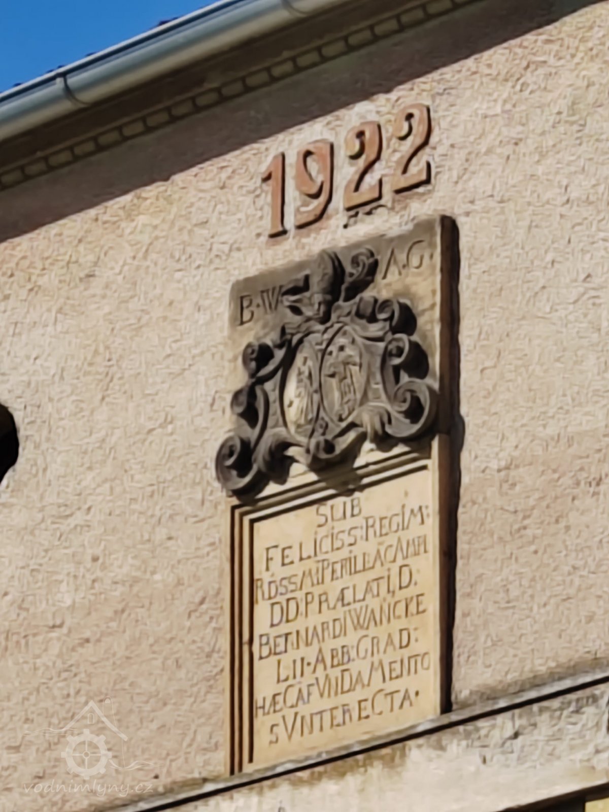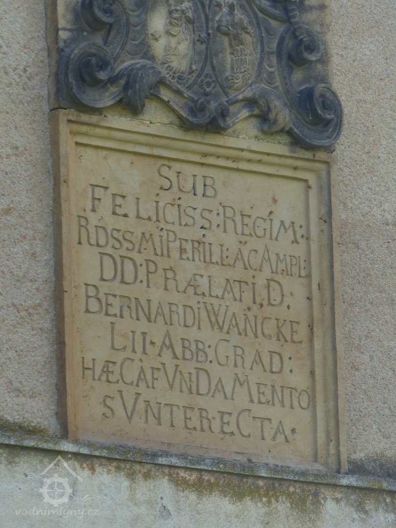 Zakládací deska opata Bernarda Wancka z roku 1710 ve štítu, 2020, © Náš mlýn v Hradčanech, (Prvky na obrázku: epigrafické památky (nápisy, datování aj.), náhrobky, pamětní desky)