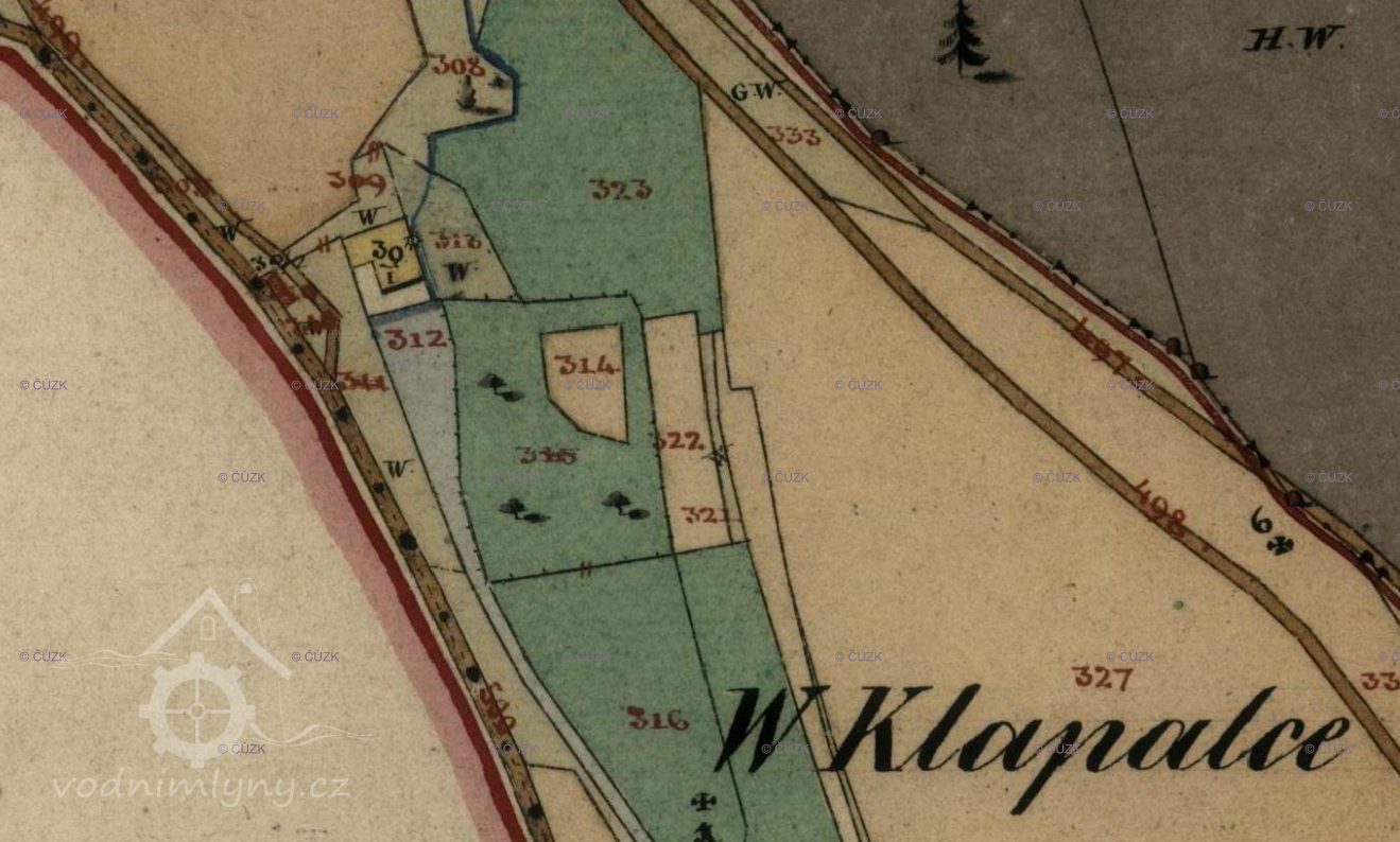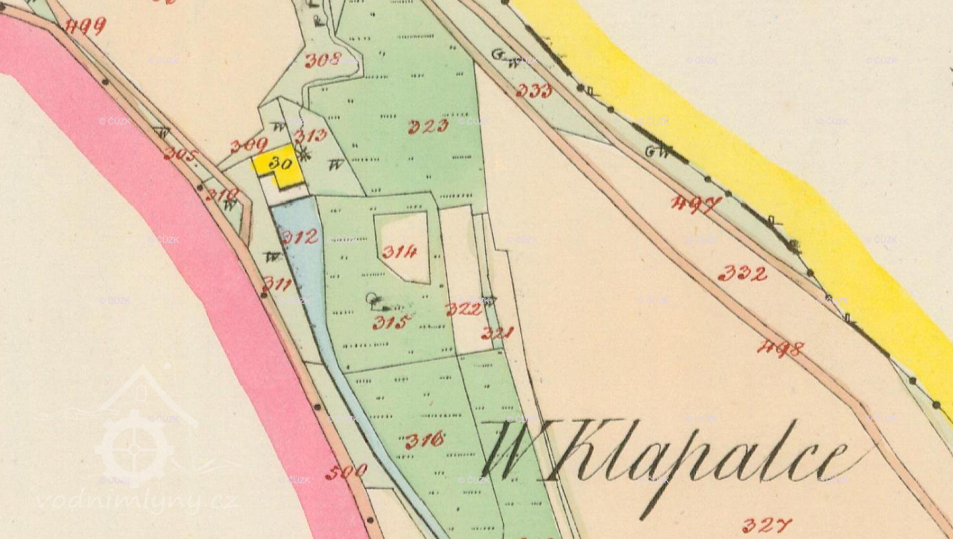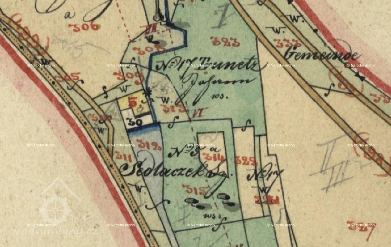 Popis1930: 1 kolo na svrchní vodu, hltnost 0,05 m3/s, spád 5 m, výkon 2,16 HP, prům. 510 cm
