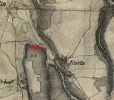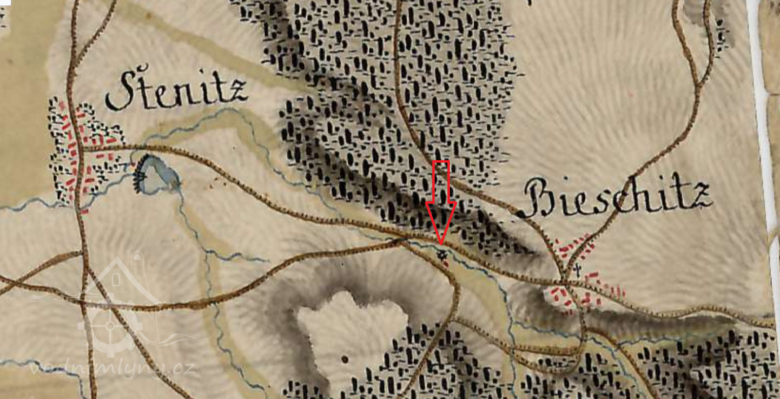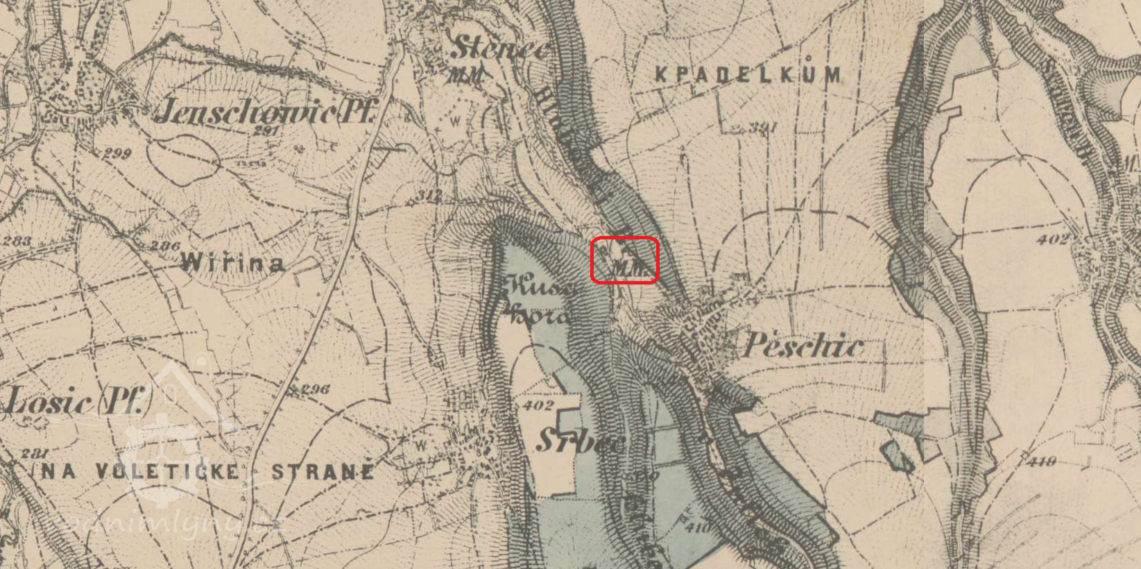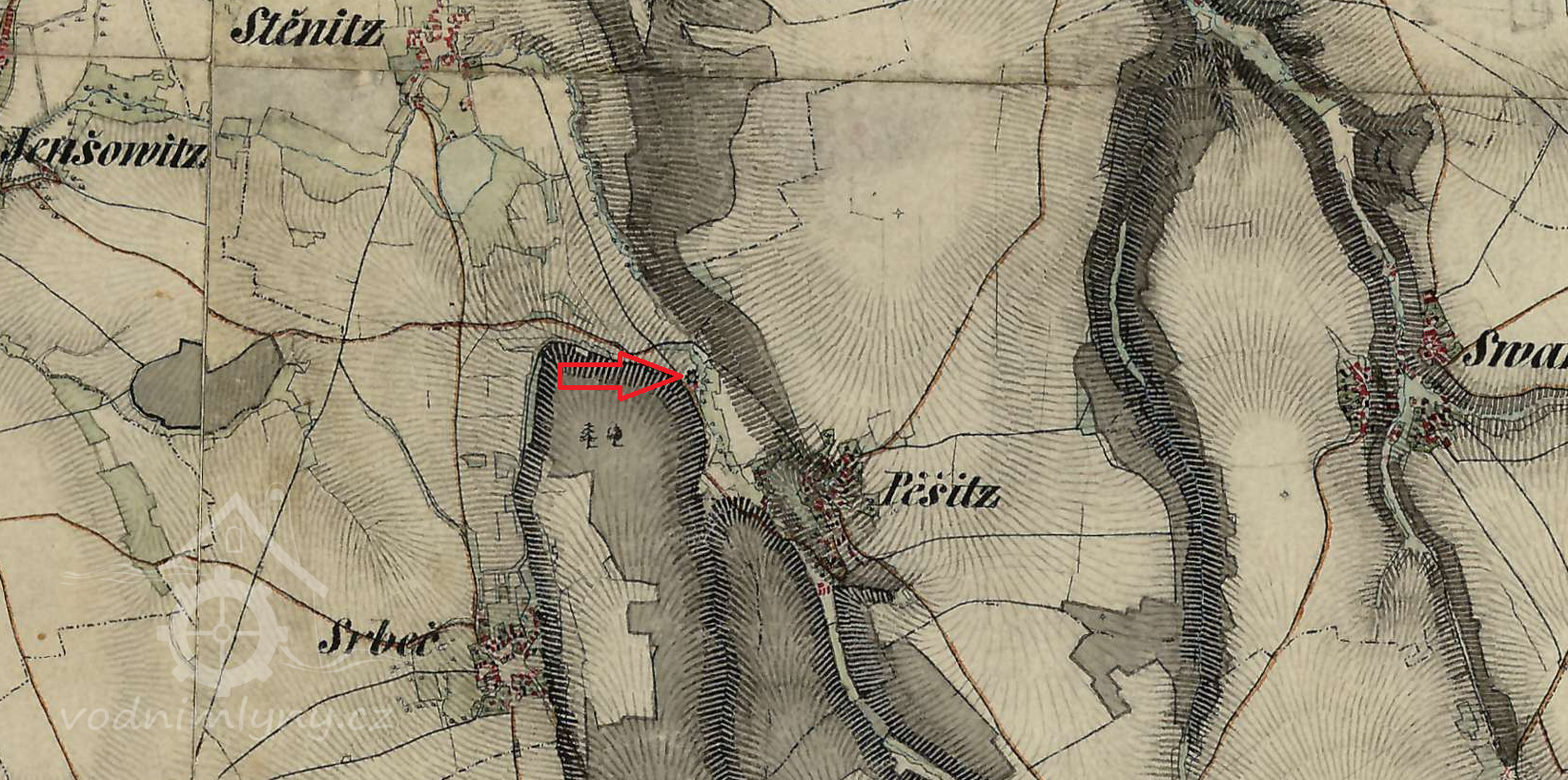 Mlýn stojí na samotě, blízko obce Pěšice.