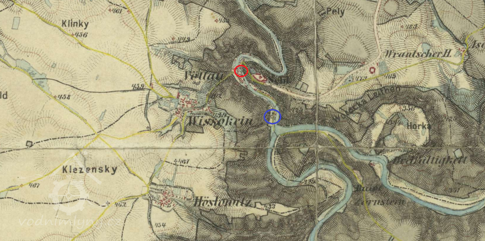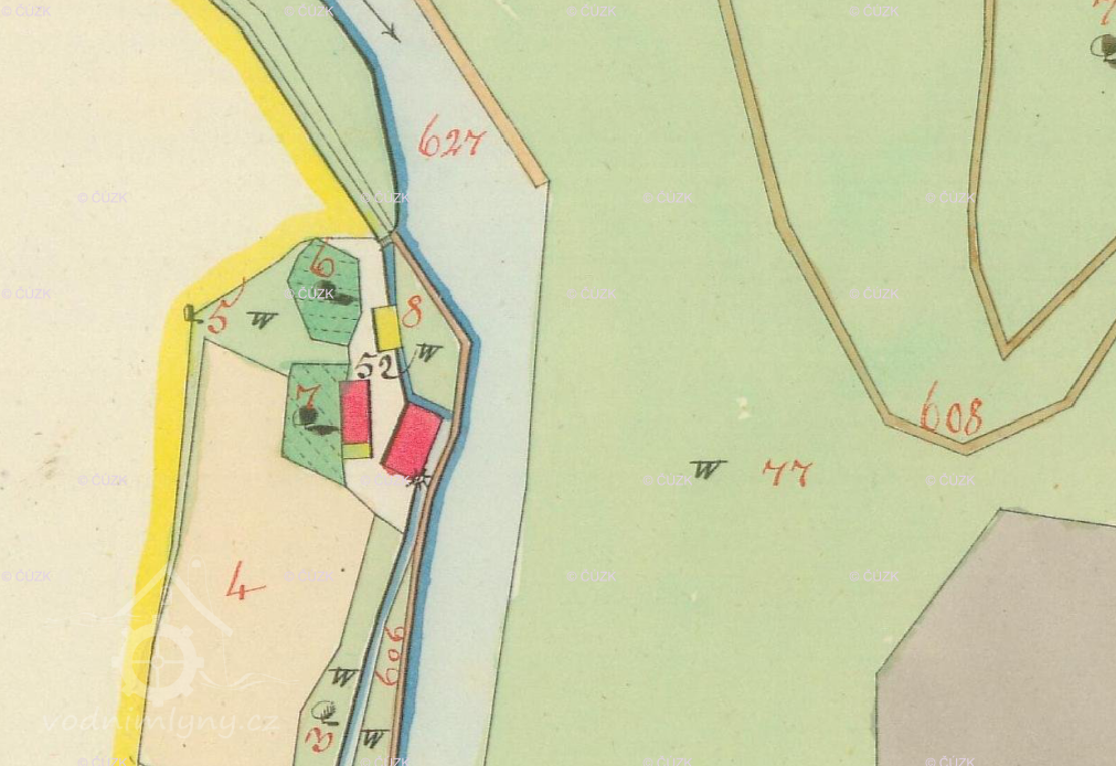 Popis1930: 2 kola na svrchní vodu, hltnost 0,223 m3/s, spád 3,35 m, výkon 6,5 HP
