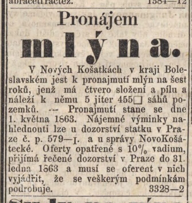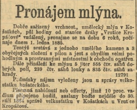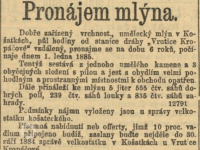 Mlýn nabízen k pronájmu od 1. ledna 1885 na dobu 6 roků. (RR)