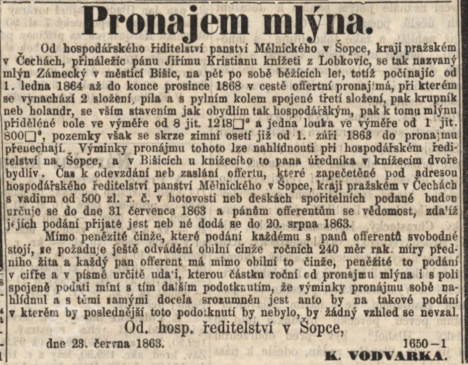 V r. 1863 byl mlýn nabízen k pronájmu.
