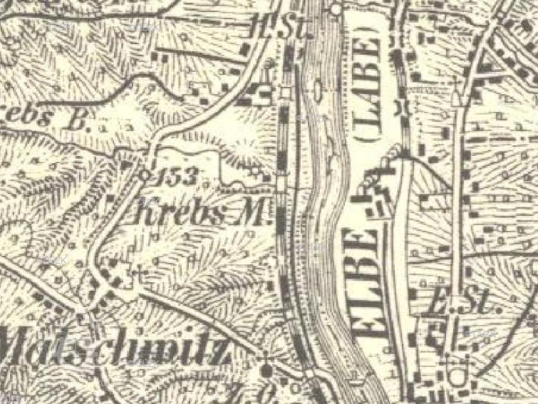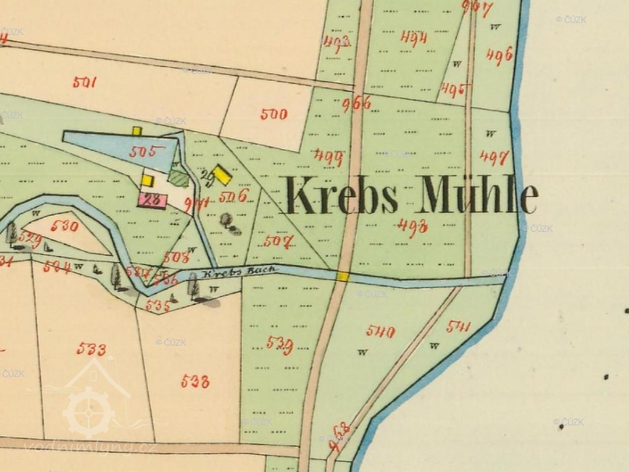 Krebsův mlýn (mlýn s jedním složením) byl součástí svobodného statku s mlýnem, který kolem roku 1420 přechází od tehdejšího majitele Krebse na panství. Majitelé panství statek po částech rozprodali. V panském zámečku, který byl zničen během 30leté války žili příbuzní rodiny von Bünau. Provoz mlýna, který vedl od roku 1700 mlynářský rod Stolzů, byl ukončen roku 1902.