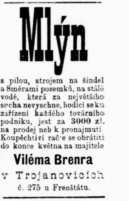 17.3.1845 hukvaldský hejtman Franz Ott doplnil žádost arcibiskupovi, že v Trojanovicích už je 269 domů a 2373 obyvatel a jsou zde pouze 4 mlýny (Káňův, Chalupův, Petrův a Šmahlíkův), které je možno provozovat pouze v období dešťů