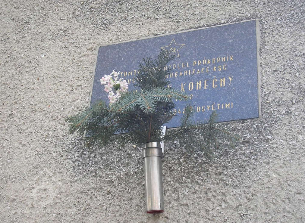 V TOMTO DOMĚ BYDLEL PRŮKOPNÍK / BRUŠPERSKÉ ORGANIZACE KSČ / FRANTIŠEK KONEČNÝ / *25.7.1892 / BYL UMUČEN 16.2.1942 V OSVĚTIMI