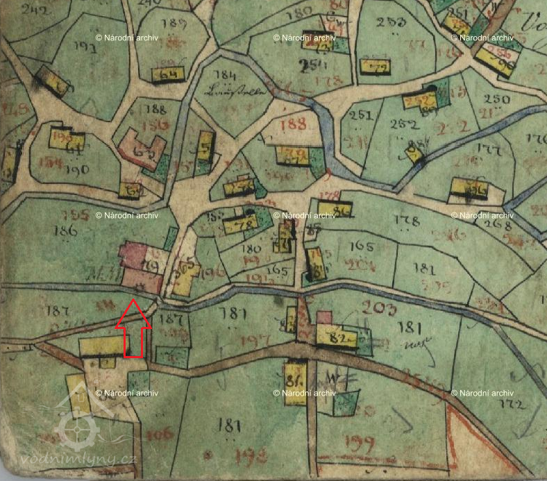 Výpis poddaných eviduje ve Velkém Šenově v roce 1752 tři mlýny. Přímo v Šenově byly dva, které později dostaly čp. 156 (Horní) a 186 (Dolní). Třetí se nazýval Pitschmühle, stál při hranici s obcí Mikulášovice a byl později uváděn s čp. 47 ve farních matrikách obce Vilémov. Na Dolním mlýně hospodařil v roce 1752 Hanns Liebisch (věk 52), s ním zde byla jeho manželka Anna Dorothea, rozená Oppitz (47), jejich děti dvojčata Hanns Michael (16) a Maria Anna (16), a dále zde byl zapsán bratr mlynářky Gabriel Oppitz.