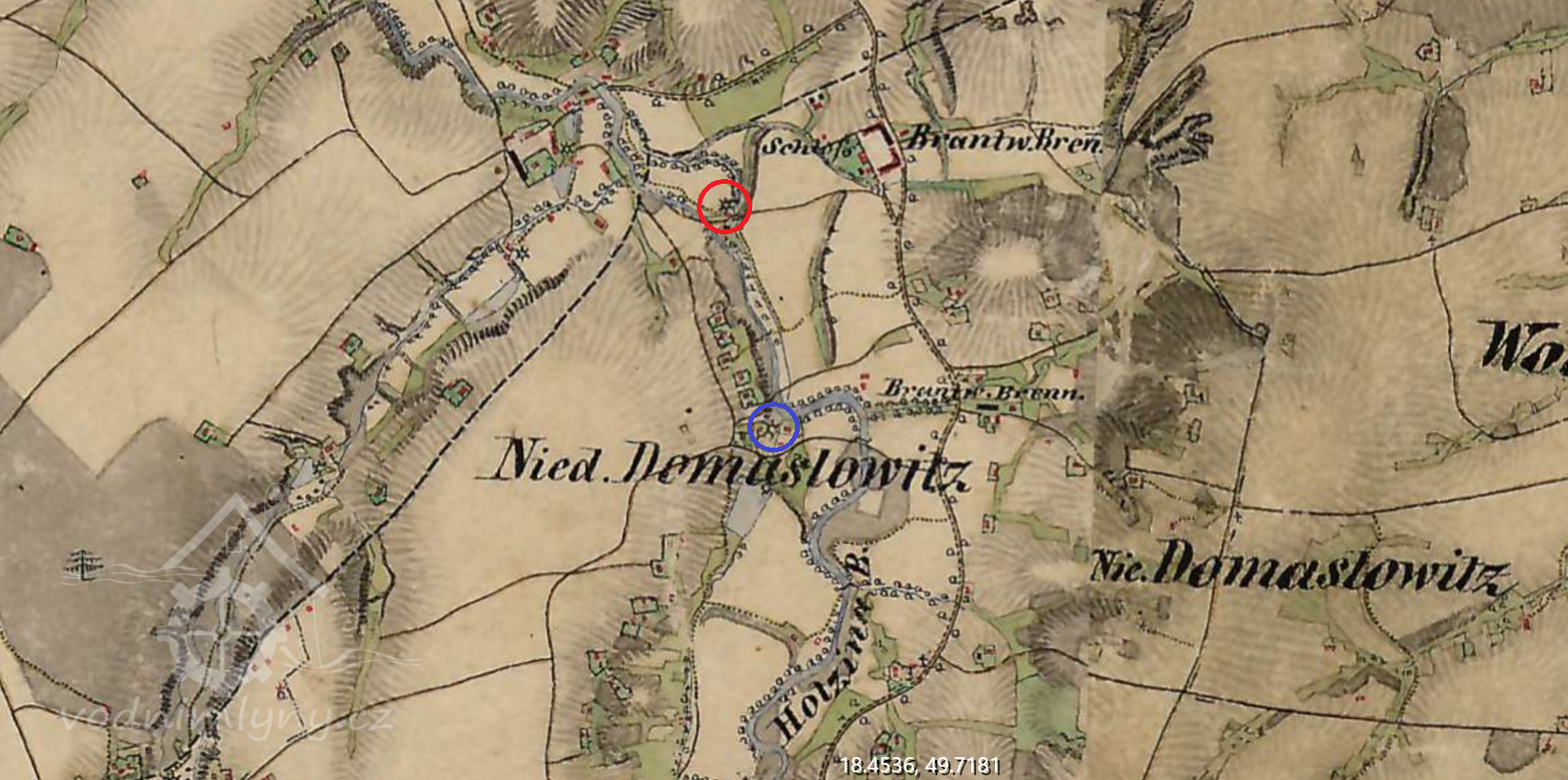 V soupise Karolinského katastru (1718 – 1729) jsou v Dolních Domaslavicích jmenovány pouze 2 mlýny na horní vodu.