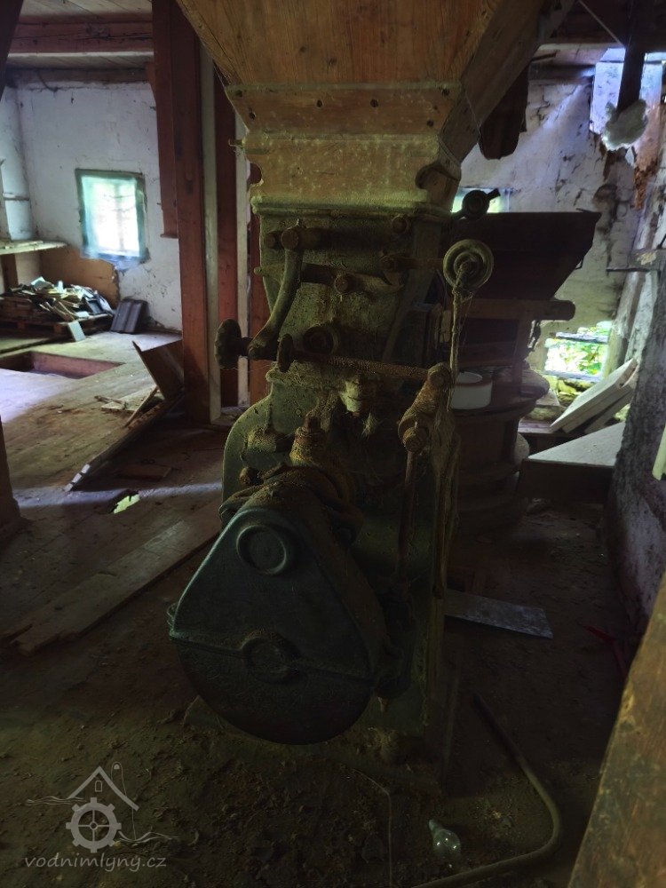 Válcová stolice a kamenné složení, 09 2025, © Jiří Landis, (Prvky na obrázku: kamenné složení (šrotovací, mlecí), válcová stolice, zásobník, násypka)