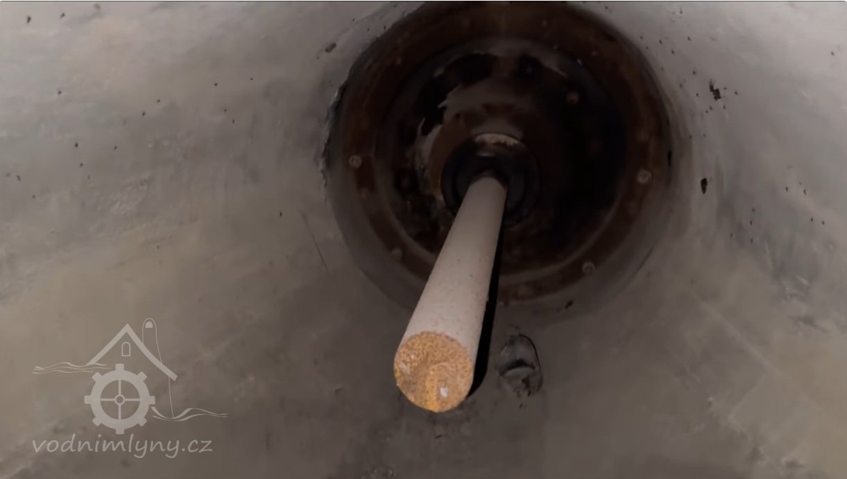 Kamenné složení a válcová stolice, 09 2025, © Jiří Landis, (Prvky na obrázku: kamenné složení (šrotovací, mlecí), válcová stolice, zásobník, násypka)
