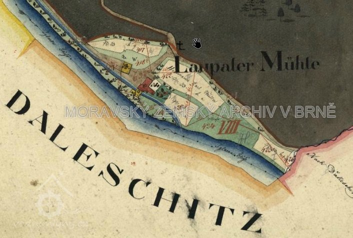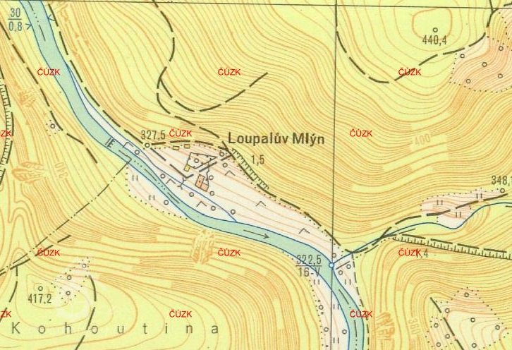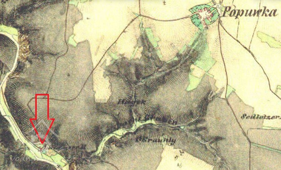 Bývalý mlýn Loupalův u Popůvek byl zbourán v roce 1970 v souvislosti s budováním vodní nádrže Dalešice.