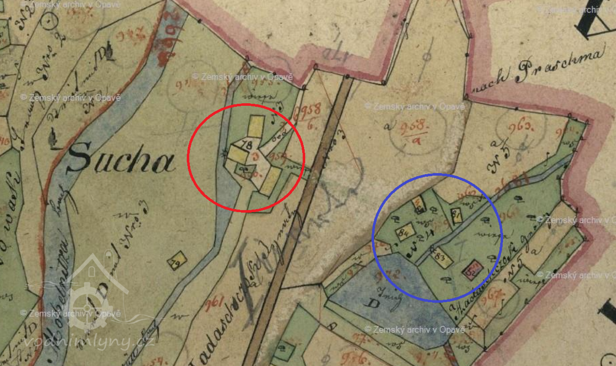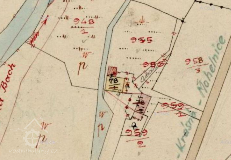 V Krásné se uvádí k roku 1843 (vceňovací operáty) dva mlýny se dvěma složeními, které zpracovaly ročně 20 měřic pšenice, 280 měřic žita. Zdejší pila měla roční kapacitu 300 desek.