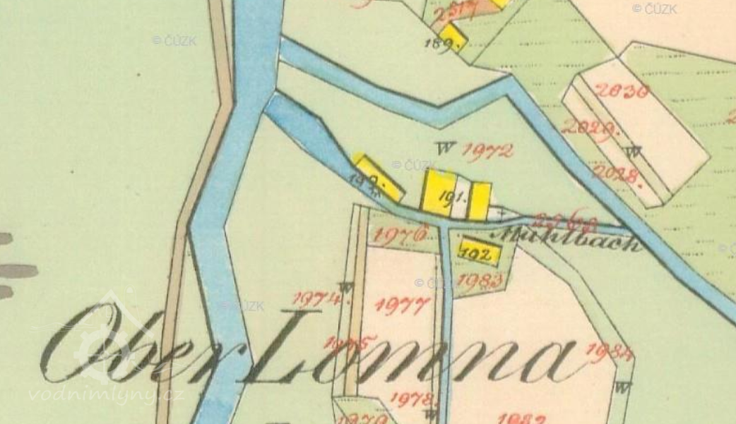 Náhon (Mühlbach) tekl těsně za oběma objekty a byl levostranným z potoka Uplaz, který tekl podél severní strany areálu. Další náhon začínal na říčce Lomné jezem a přímou linií směřoval k parc. č. 191, kde se napojoval do výše zmíněného náhonu. Jako jeden náhon pak vtékal do Lomné pod jejím soutokem s potokem Uplaz. Rýha náhonu je nevýrazně zachována jižně od čp. 47 v zadní části louky až po Lomnou.