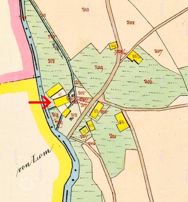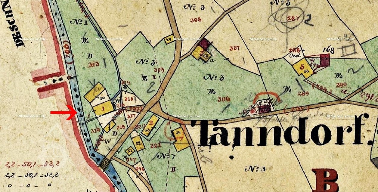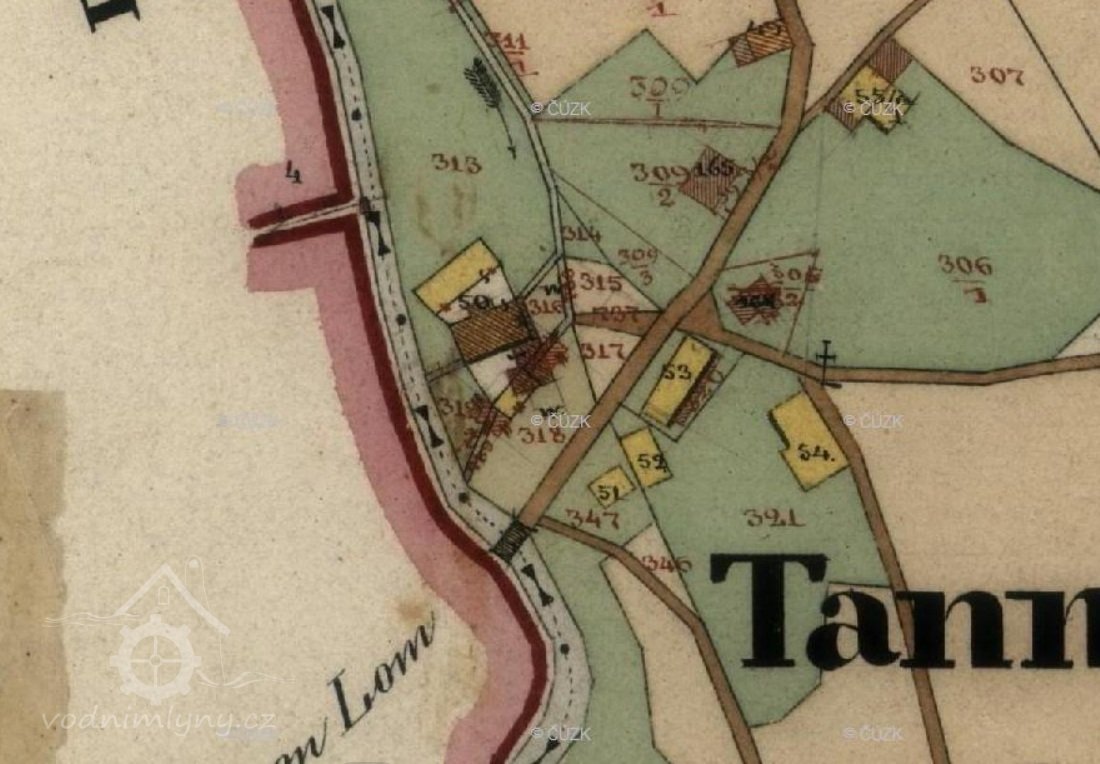 1798 Dolní mlýn, jedno moučné složení a pila na řezání prken. Mlynář Antonín Abel platí ročně z mlýna 14 zl. a z pily do důchodu vrchnosti 4 zl.