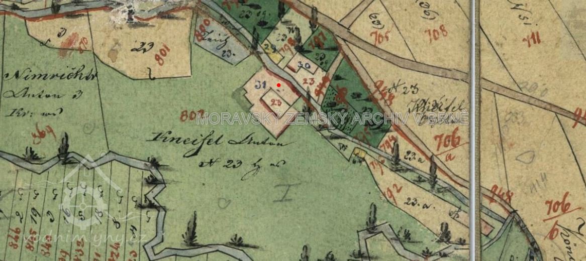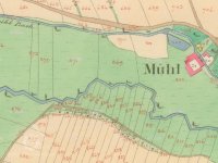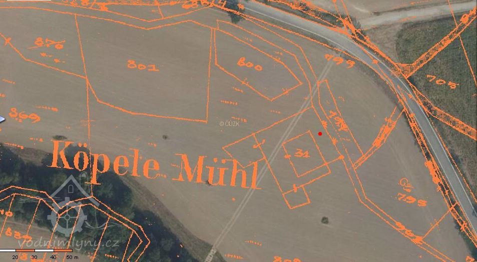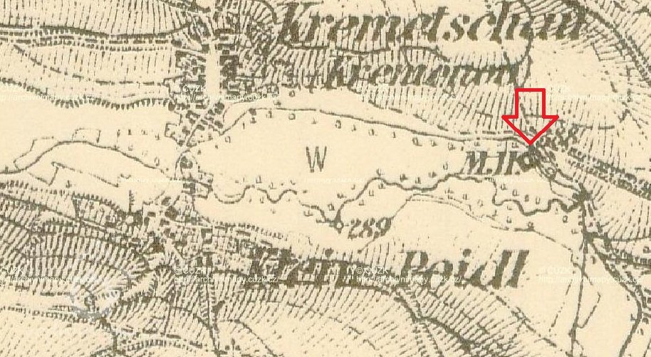 Osamocený Křemačovský mlýn měl vlastní náhon plus vypouštěná voda z mlýna v Podolíčku (1834).