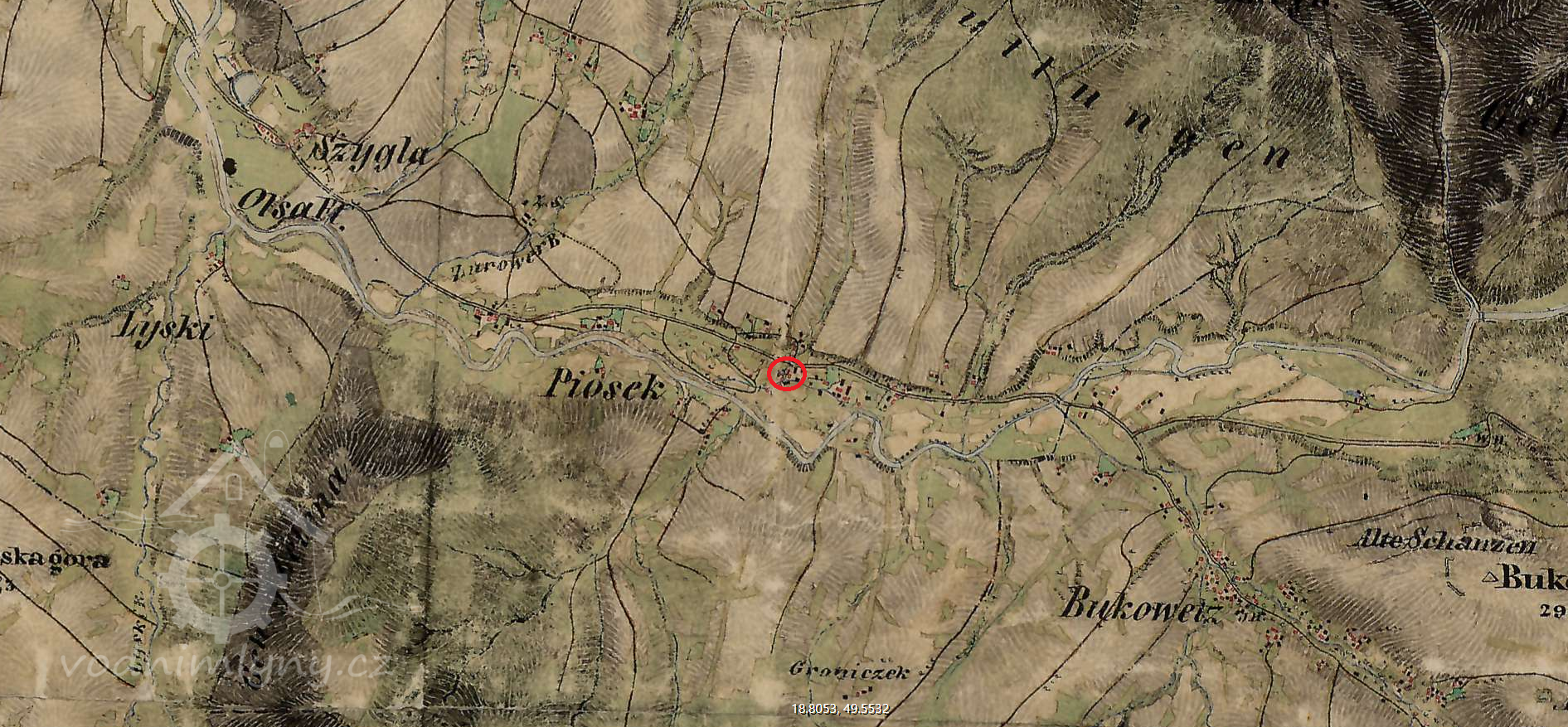 „Několik desítek let před druhou světovou válkou sloužil obyvatelům obce Písek starý vodní mlýn s pilou. Pokud někdy půjdete od Obecního úřadu v Písku k řece Olši, po několika desítkách metrů si můžete po levé straně všimnout strouhy s rozšířeným korytem, jejíž stěny jsou vyloženy kamením. Zde stával starý písecký vodní mlýn a pila.