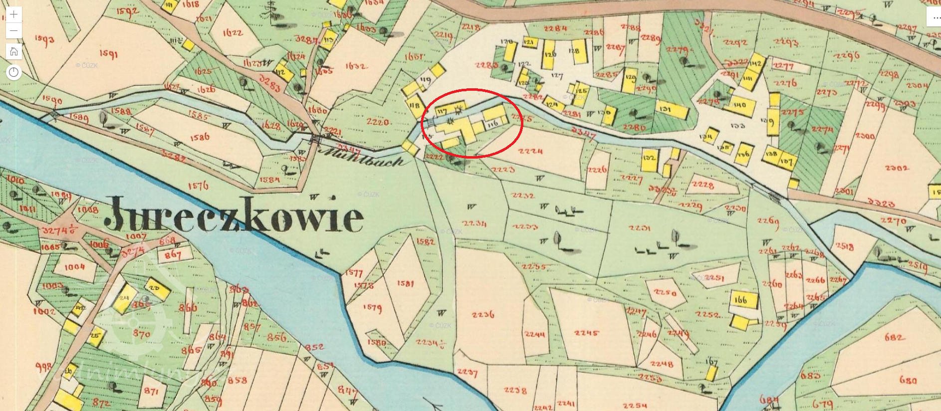 V roce 1906 byli majiteli mlýnu Chraścinovi - prarodiče paní Klusové. Po nich mlýn převzal Paveł Klus a následně manželé Klusovi, které jsme představili v úvodu. Paměť rodiny ale sahá ještě před pana Chraścinu k panu Zmudovi, který byl prvním manželem paní Marie (později Chraścinové). Před nimi byl údajně majitelem starého stavení nějaký Žid, jehož jméno se nepodařilo doložit.