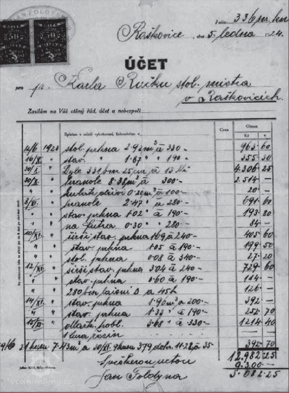 Dřevěná vodní kola pily byla zrušena přibližně před 55 lety. Dědeček současného majitele, Jan Foldyna ml., upravil v roce 1929 starší objekt pily a mlýna na