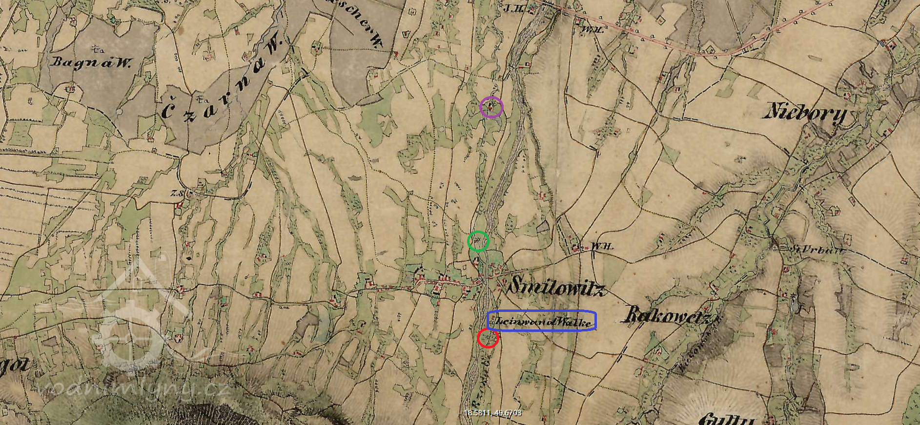 Na levém břehu smilovické řeky Ropičanky stály na přelomu století 19. a 20. poblíž místa, kde v dnešní době přehrazuje Ropičanku jez, z kterého se odvádí část vody umělým kanálem a potoky do říčky Stonávky pro napájení Těrlické přehrady, tři stavení. Ve dvou z nich žili pan Pavel Walach, ročník 1878 a jeho zeť ze sousedství pan Pavel Jursa, ročník 1888. Pan Walach byl vyučen kovářem a měl kovárnu a jeho zeť Pavel Jursa byl zedníkem. Ve třetí usedlosti bydlela rodina Březinů, která provozovala kovářství. Tito pánové se dohodli, že spolu postaví vodní pilu.