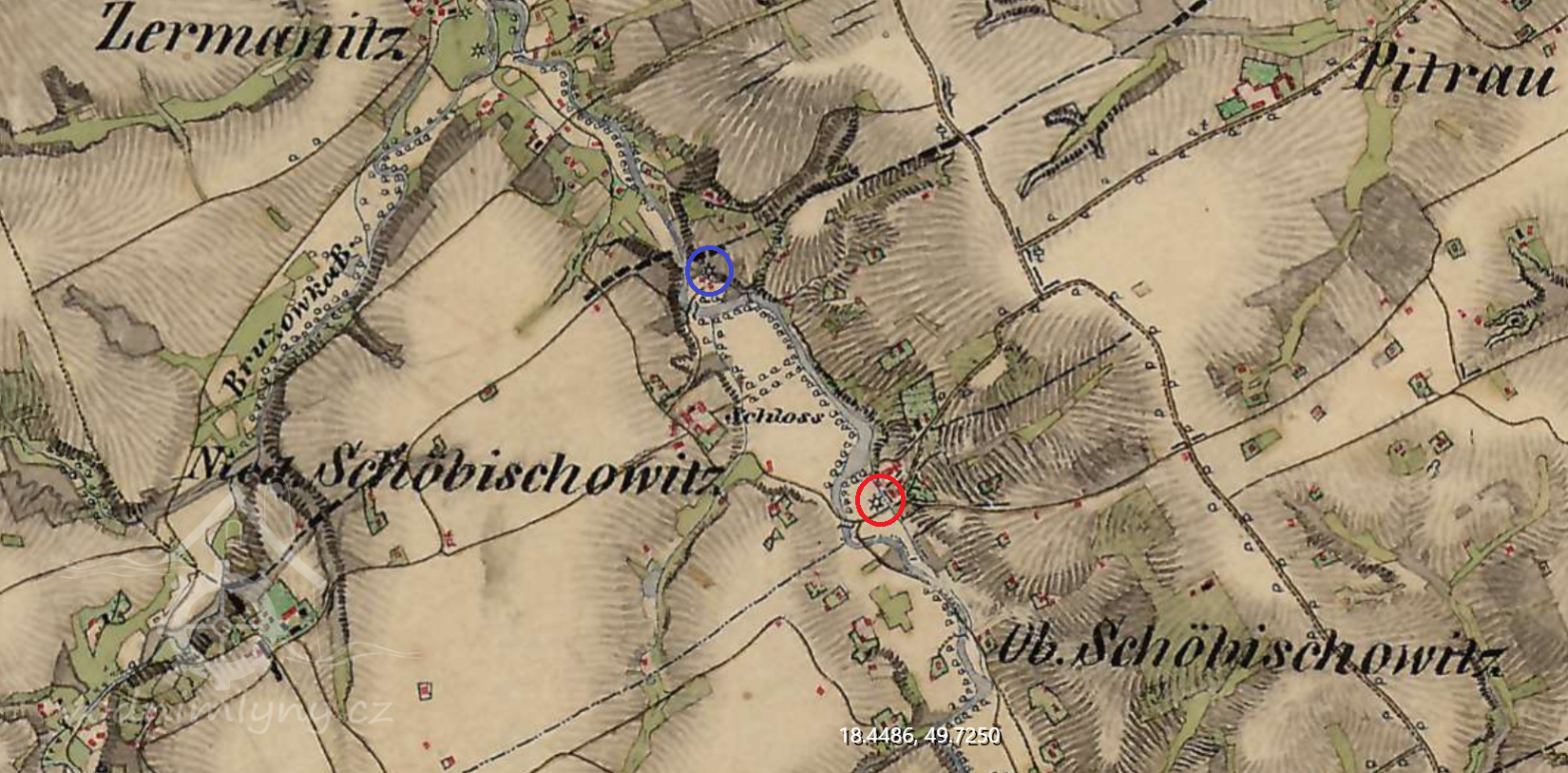 Dolní Soběšovice měly dva vodní mlýny. Podle farské kroniky byl na tomto mlýně mlynářem Michal Hanušek. Mlýn na horní vodu zpracoval ročně 100 měřic pšenice, 156 měřic žita, 50 měřic ječmene a 150 měřic ovsa.