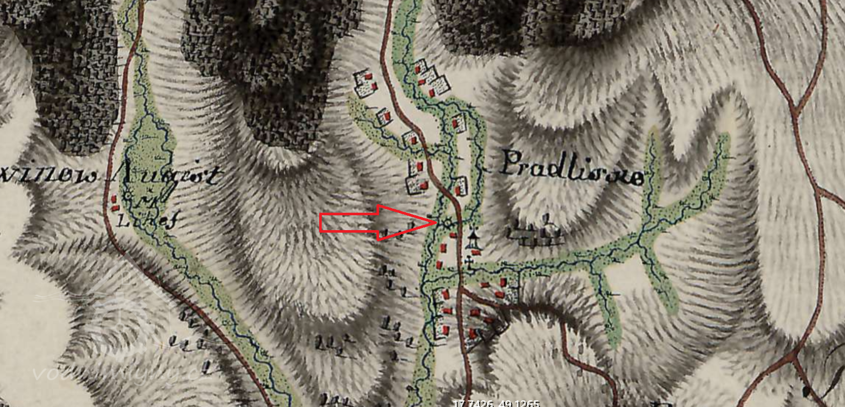 Mlýn se nachází mimo obec v lokalitě Pradlisko