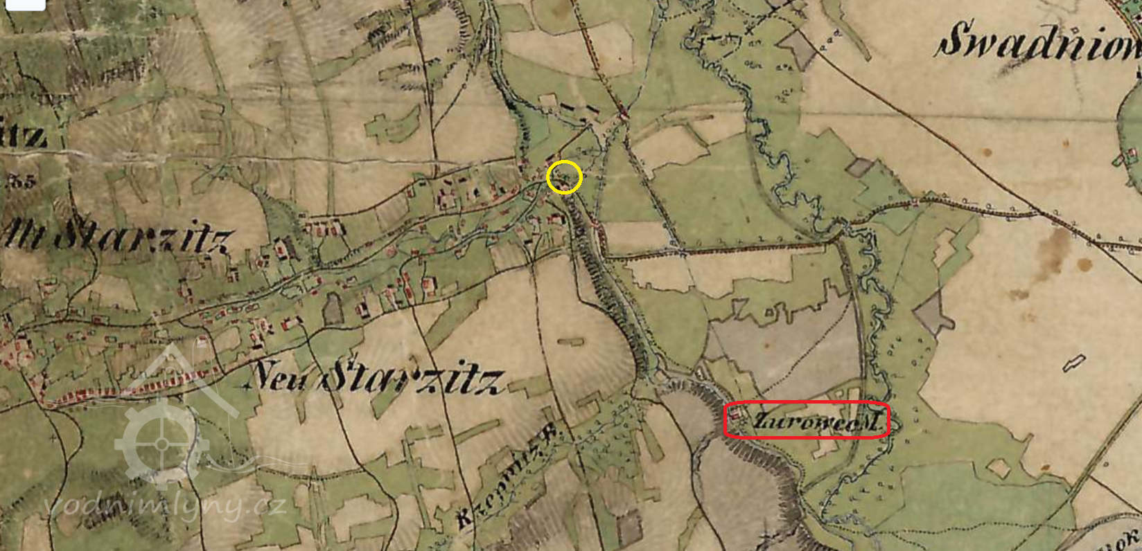 Horní (červeně) a Dolní (žlutě) mlýn ve Staříči, II. vojenské mapování, výřez, 1836-1852, © mapire.eu