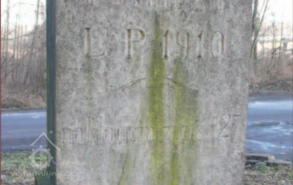Letopočet 1910 na podstavci kříže, 2013, © Vodní mlýny na Frýdecko-Místecku, (Prvky na obrázku: epigrafické památky (nápisy, datování aj.), drobné sakrální památky)