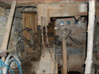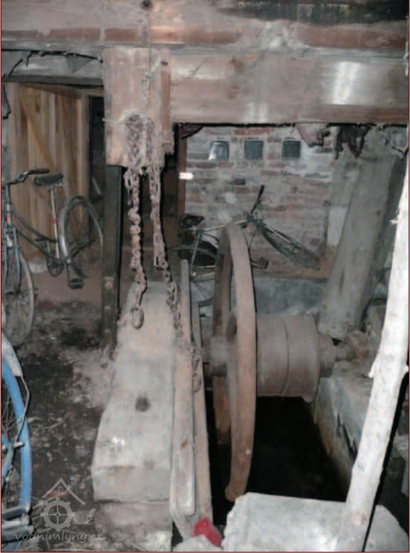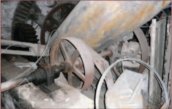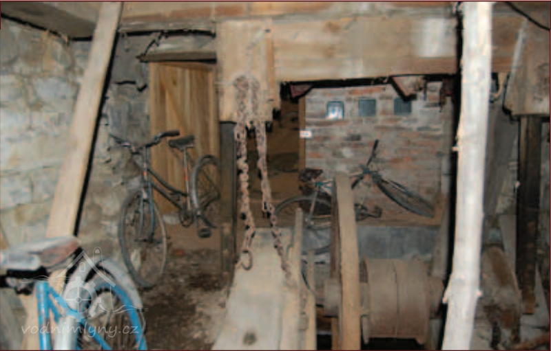 Technologické zařízení v suterénu mlýna, 2013, © Vodní mlýny na Frýdecko-Místecku, (Prvky na obrázku: transmise, řemenice, převody - ozubená kola, pastorky (průmyslový výrobek), transmise, řemenice, převody - transmisní hřídele s řemenicemi (výrobek průmyslový i řemeslný))