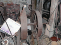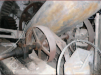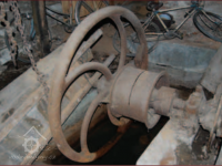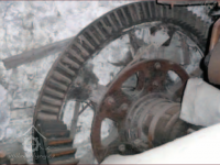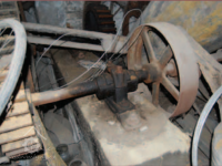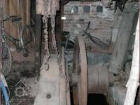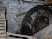 Zbytky technologie v suterénu pily, 2013, © Vodní mlýny na Frýdecko-Místecku, (Prvky na obrázku: transmise, řemenice, převody - ozubená kola, pastorky (průmyslový výrobek))