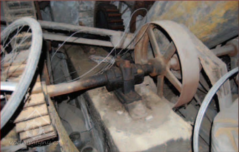 Převod z hřídele vodního kola, 2013, © Vodní mlýny na Frýdecko-Místecku, (Prvky na obrázku: transmise, řemenice, převody - ozubená kola, pastorky (průmyslový výrobek))
