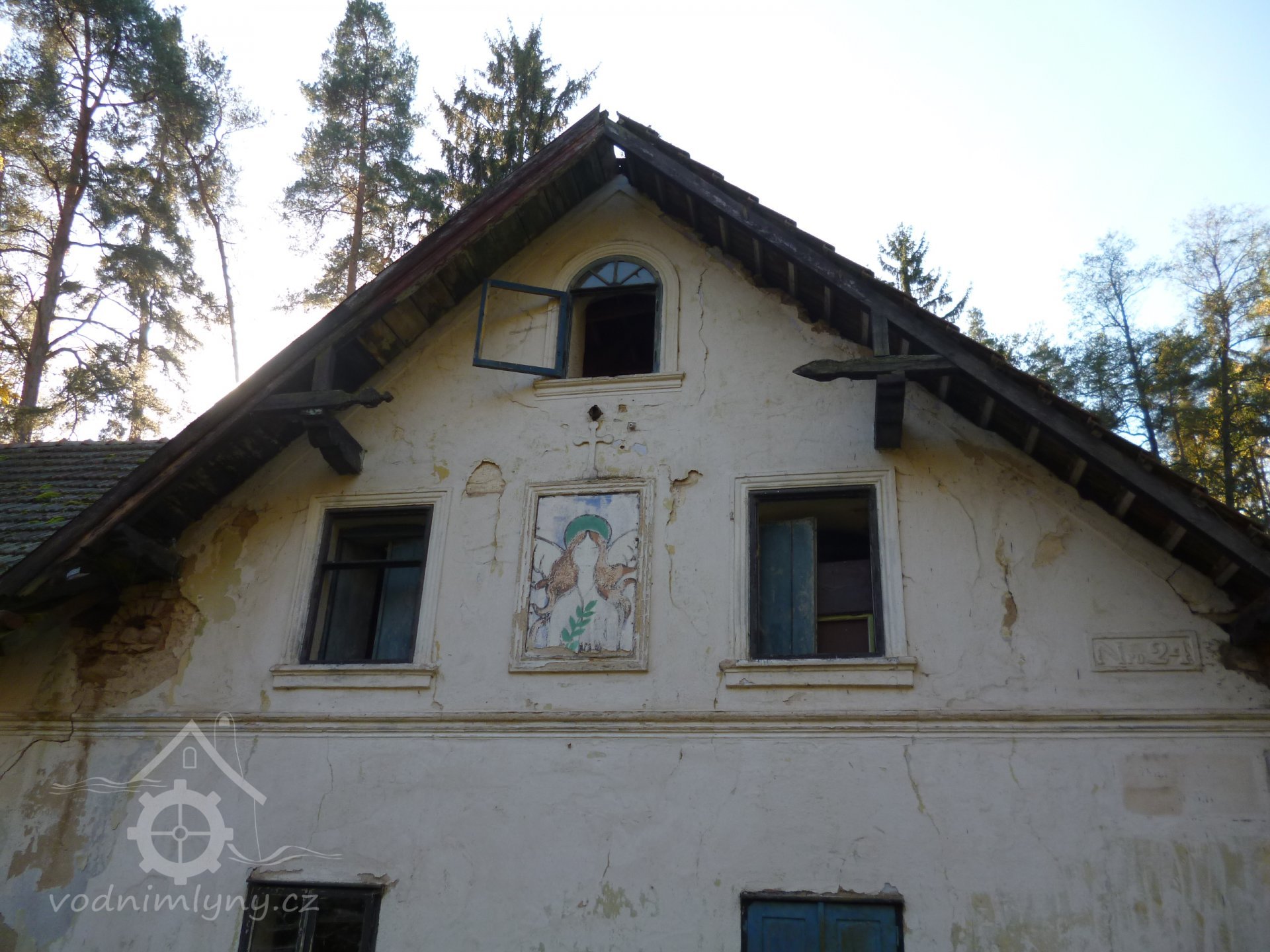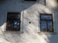 Severní štít obytné části, 2019, © Martina Havelková, (Prvky na obrázku: okno, epigrafické památky (nápisy, datování aj.), plastická omítková výzdoba fasád a štítů, malovaná výzdoba fasád a štítů)