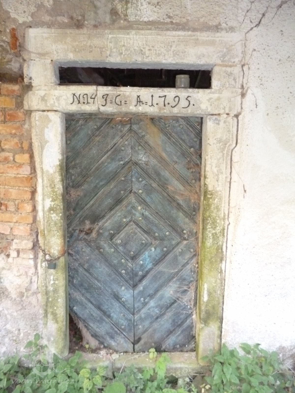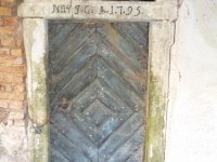 Vstup do obytné části ze dvora na západě,monogram JG a letopočet 1795, 2019, © Martina Havelková, (Prvky na obrázku: dveře, epigrafické památky (nápisy, datování aj.))