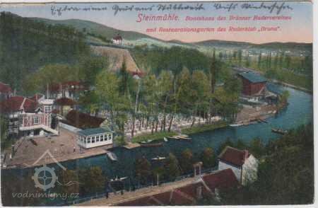 Pohlednice - mlýn, loděnice, Spolek veslařů, 191?, © valentinska.cz